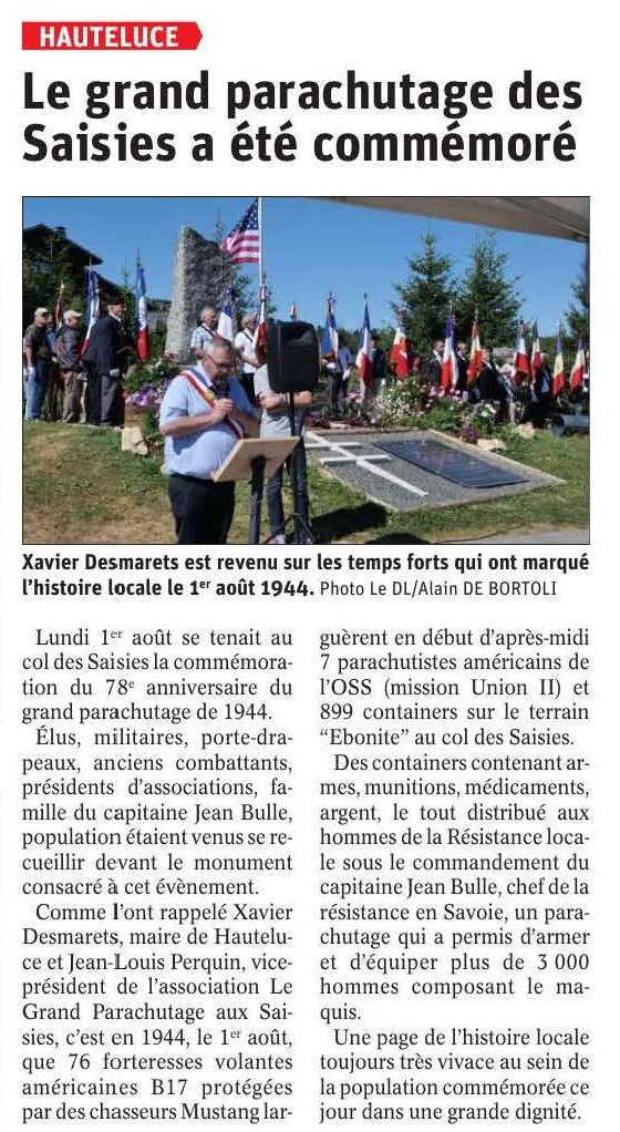 Très belle cérémonie en présence de monsieur Xavier Desmarets, maire de Hauteluce, de madame Martine Berthet, sénatrice, des autorités civiles et militaire et de la Délégation Générale du Souvenir Français de Savoie, représentée par les Délégués Généraux Adjoints : Henri Gottero (Maurienne), François Rieu (Albertville et Tarentaise) et Jean-Yves Sardella (Grand Lac, Bauges et Avt Pays Savoyard) ainsi que du comité de La Combe de Savoie et de nombreux membres, en souvenir du parachutage du 1er août 1944 et afin de rendre hommage à tous les Résistants qui permirent la Libération de la Savoie.