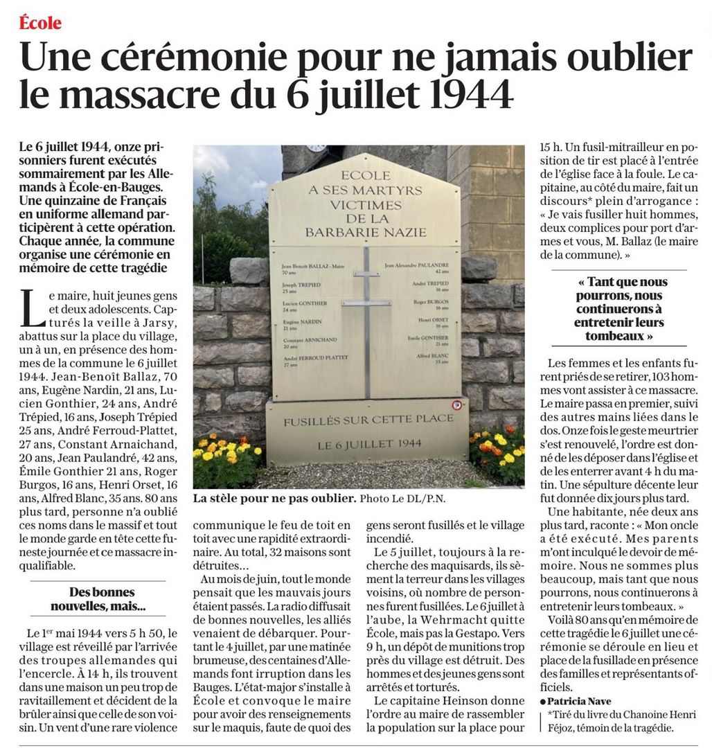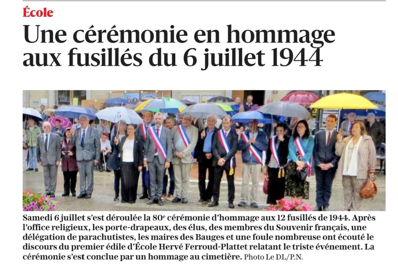 Samedi 6 juillet 2024, après la cérémonie religieuse,s'est déroulée la cérémonie en hommage aux Fusillés d'École en Bauges. Après la messe, Monsieur le maire d’École en Bauges, retraça cette tragédie, devant de nombreux maires des communes avoisinantes, Madame Claire Koch-Crouzier, directrice de l'ONaCVG, la gendarmerie, les Anciens combattants, le Souvenir Français, représenté par Jean-Yves Sardella délégué général adjoint, Nicole Guéry présidente du comité des Bauges accompagnée de membres de son comité, les 13 porte-drapeaux et de l'assemblée nombreuse.