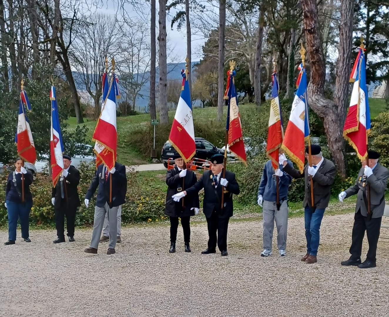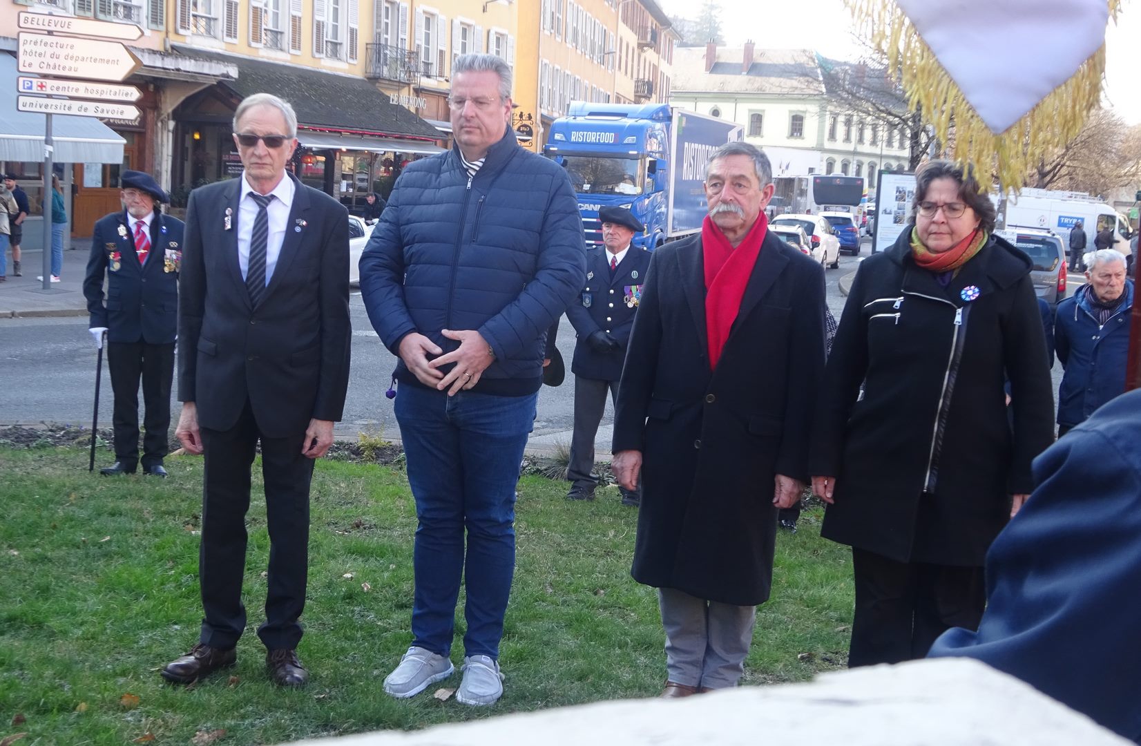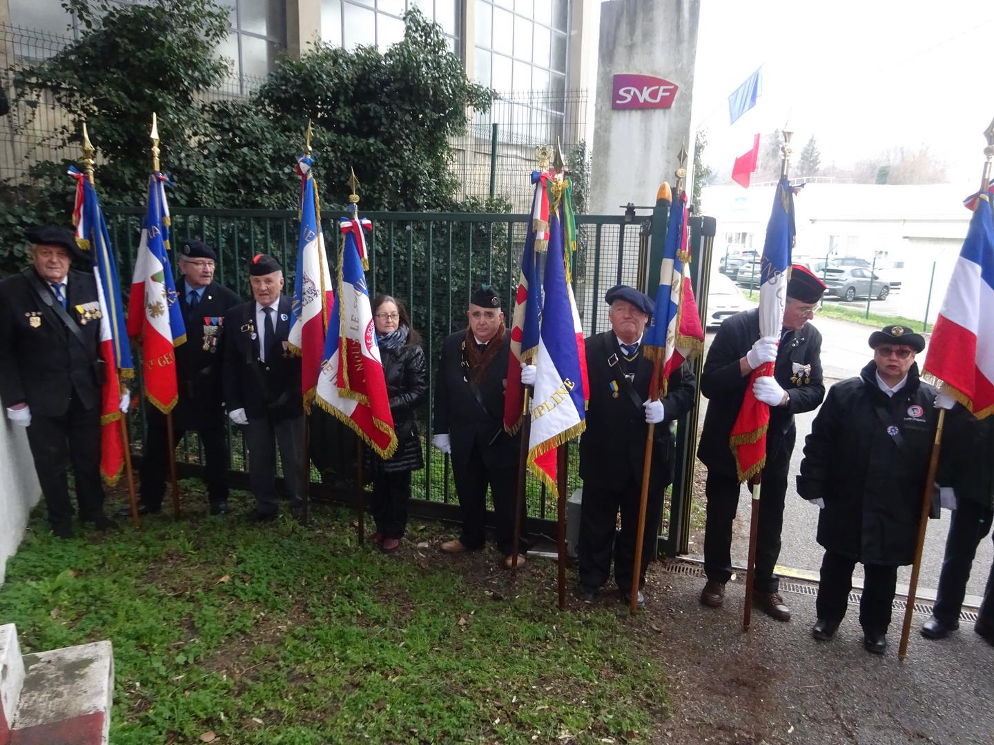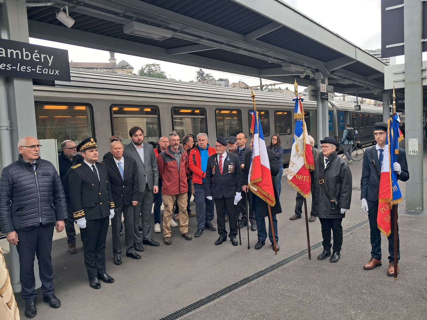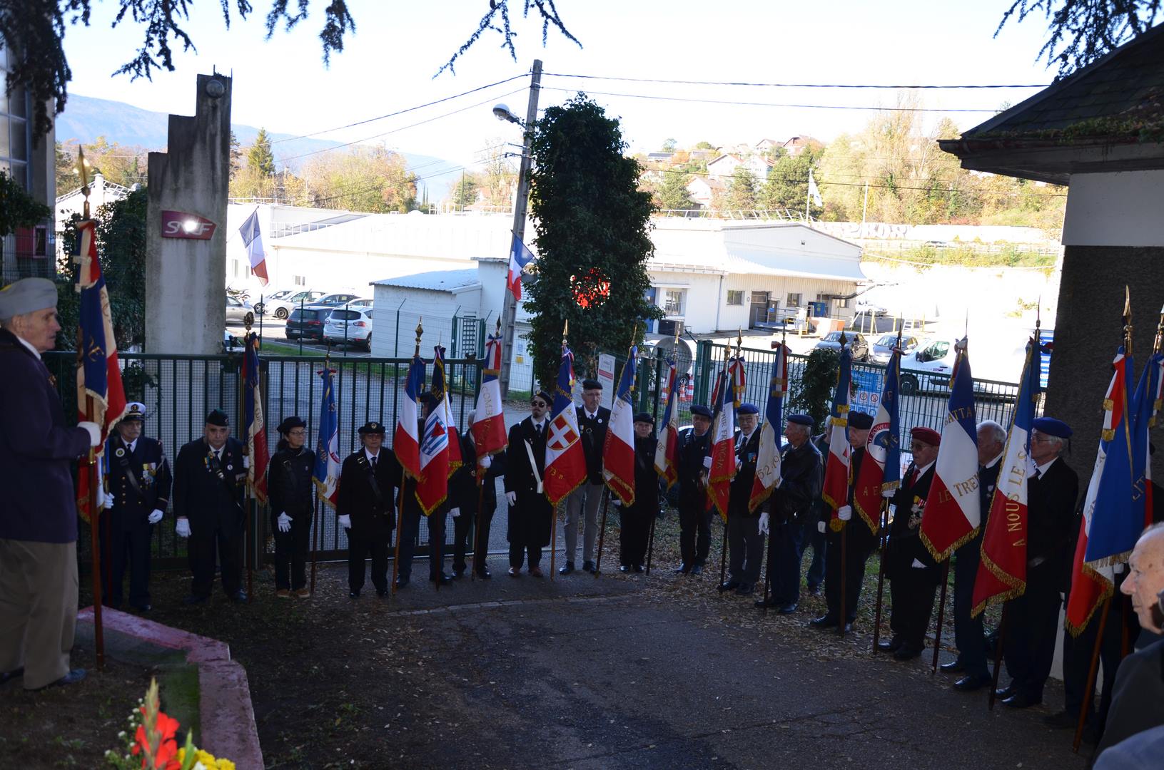 De nombreux porte-drapeaux étaient présents, entourant la délégation du Souvenir français, les présidents de comité, Chambéry, Combe de Savoie, de Henri Gottero président des anciens combattants cheminots de Savoie ainsi que des associations mémorielles.