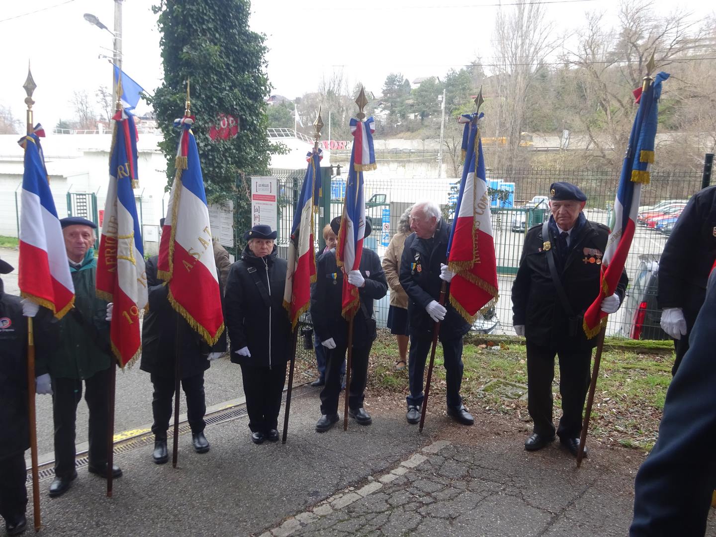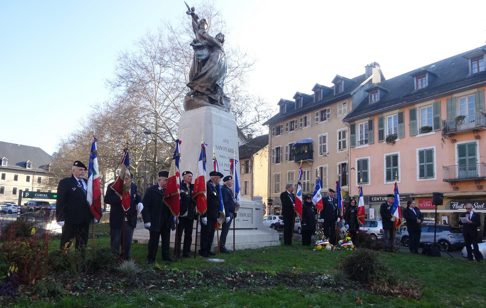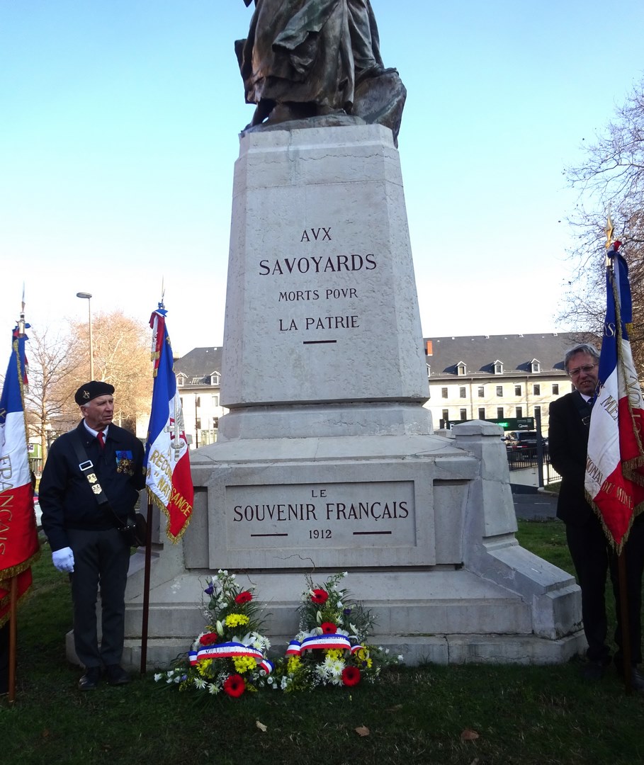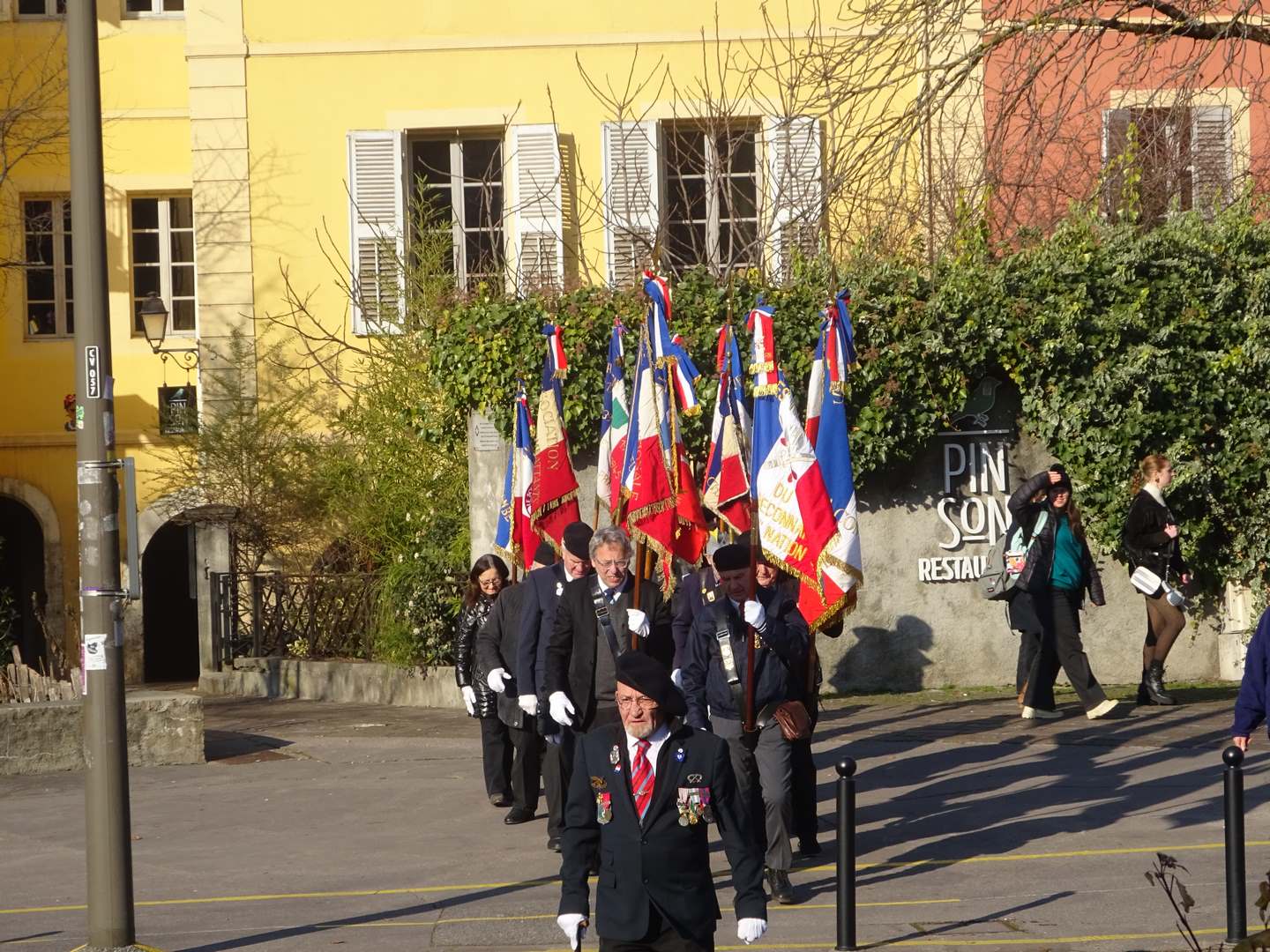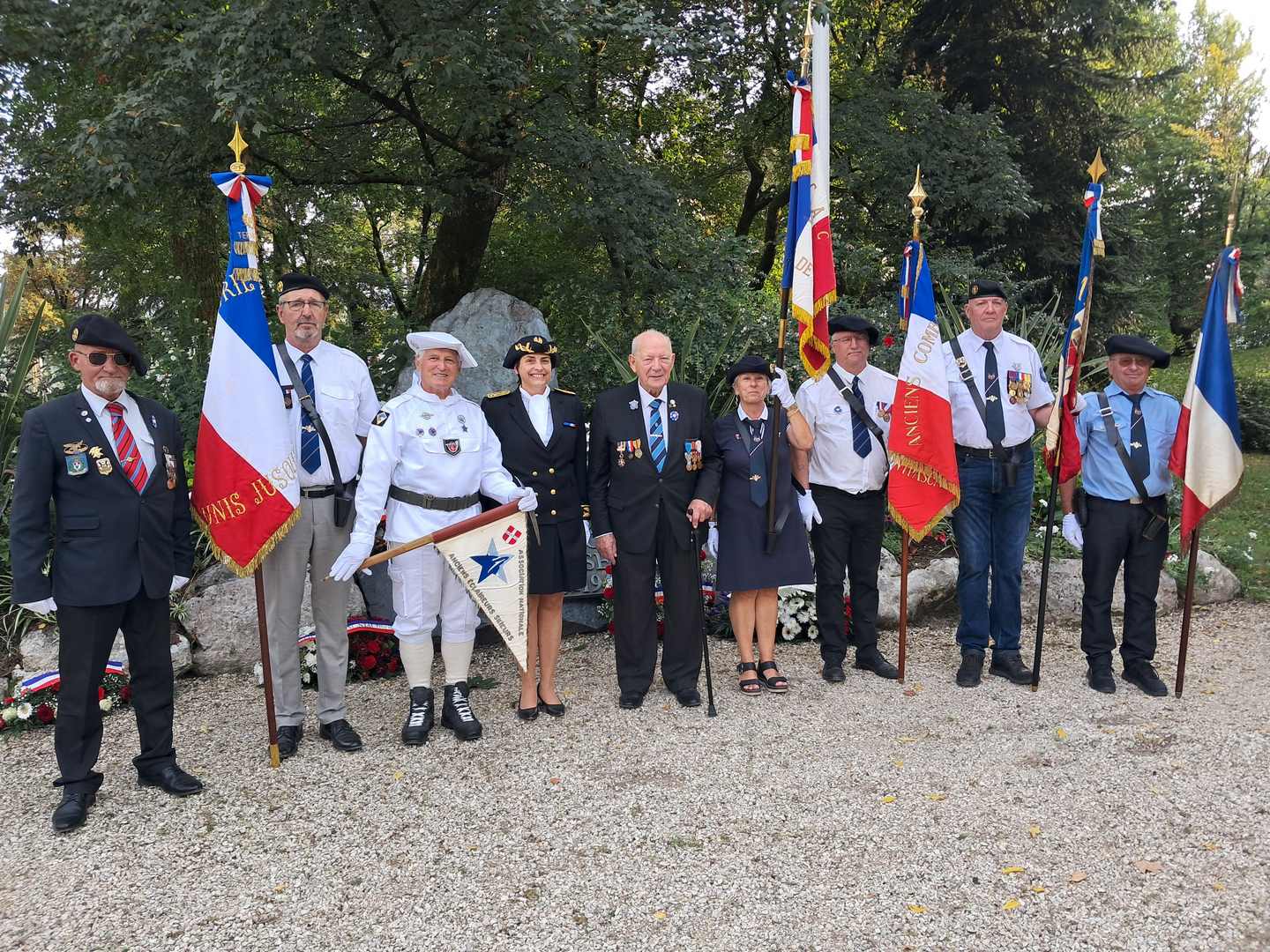 De nombreux porte-drapeaux étaient présents, entourant la délégation du Souvenir français, les présidents de comité, Chambéry, Combe de Savoie, de Henri Gottero président des anciens combattants cheminots de Savoie ainsi que des associations mémorielles.