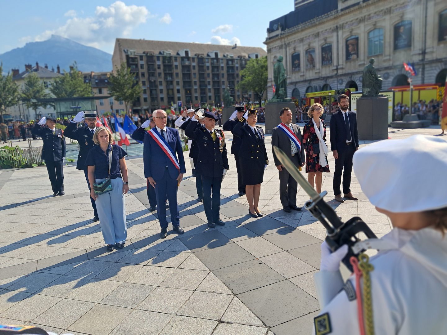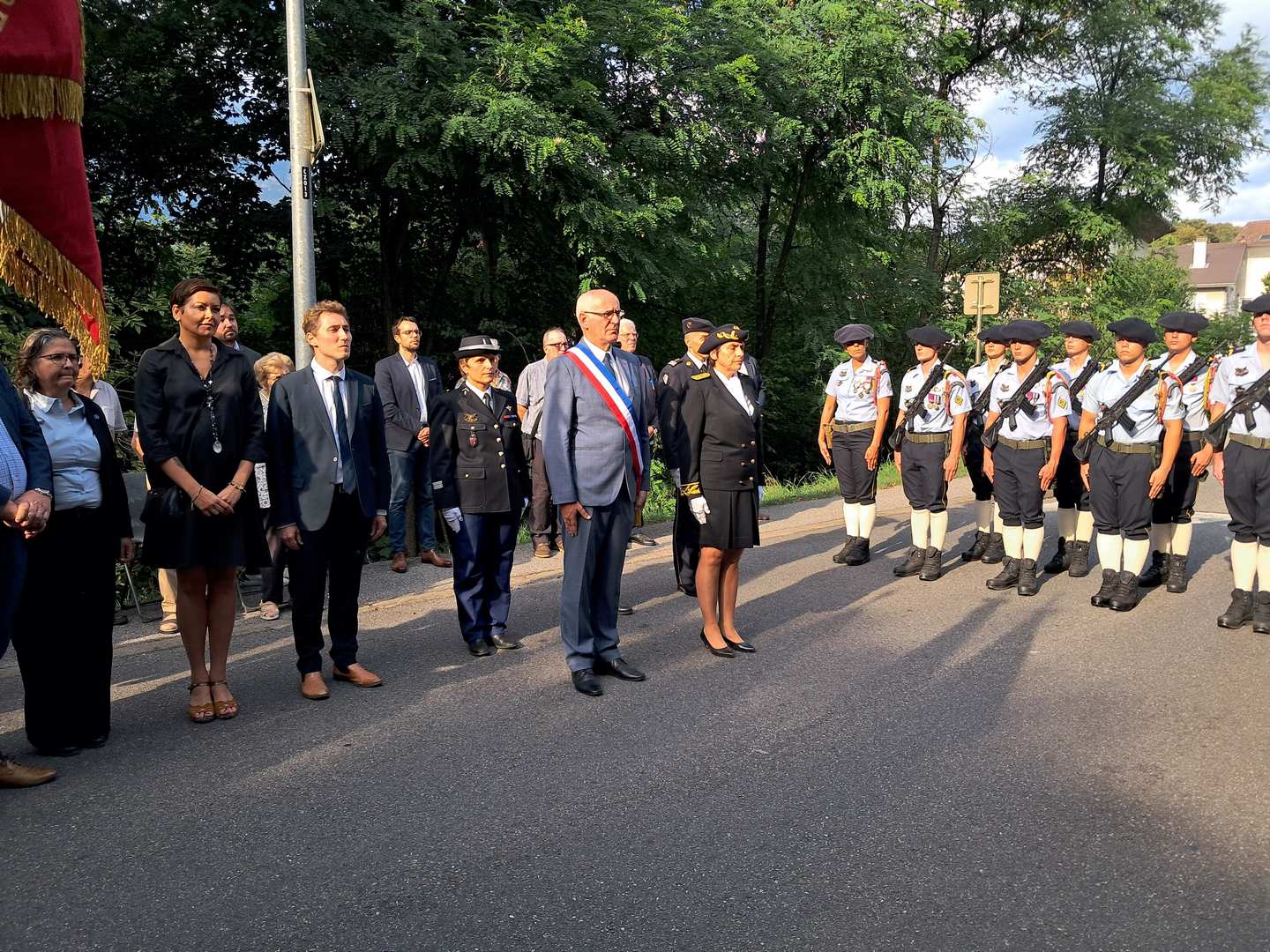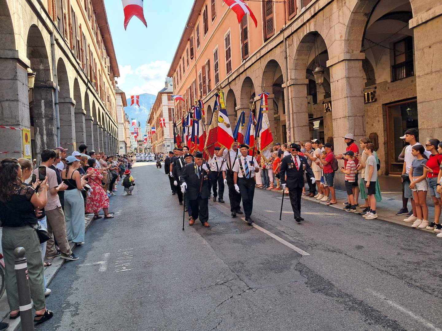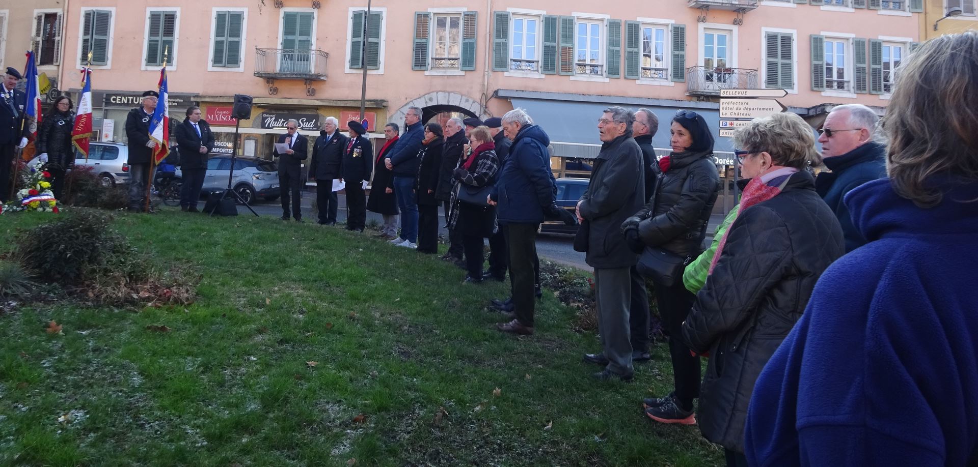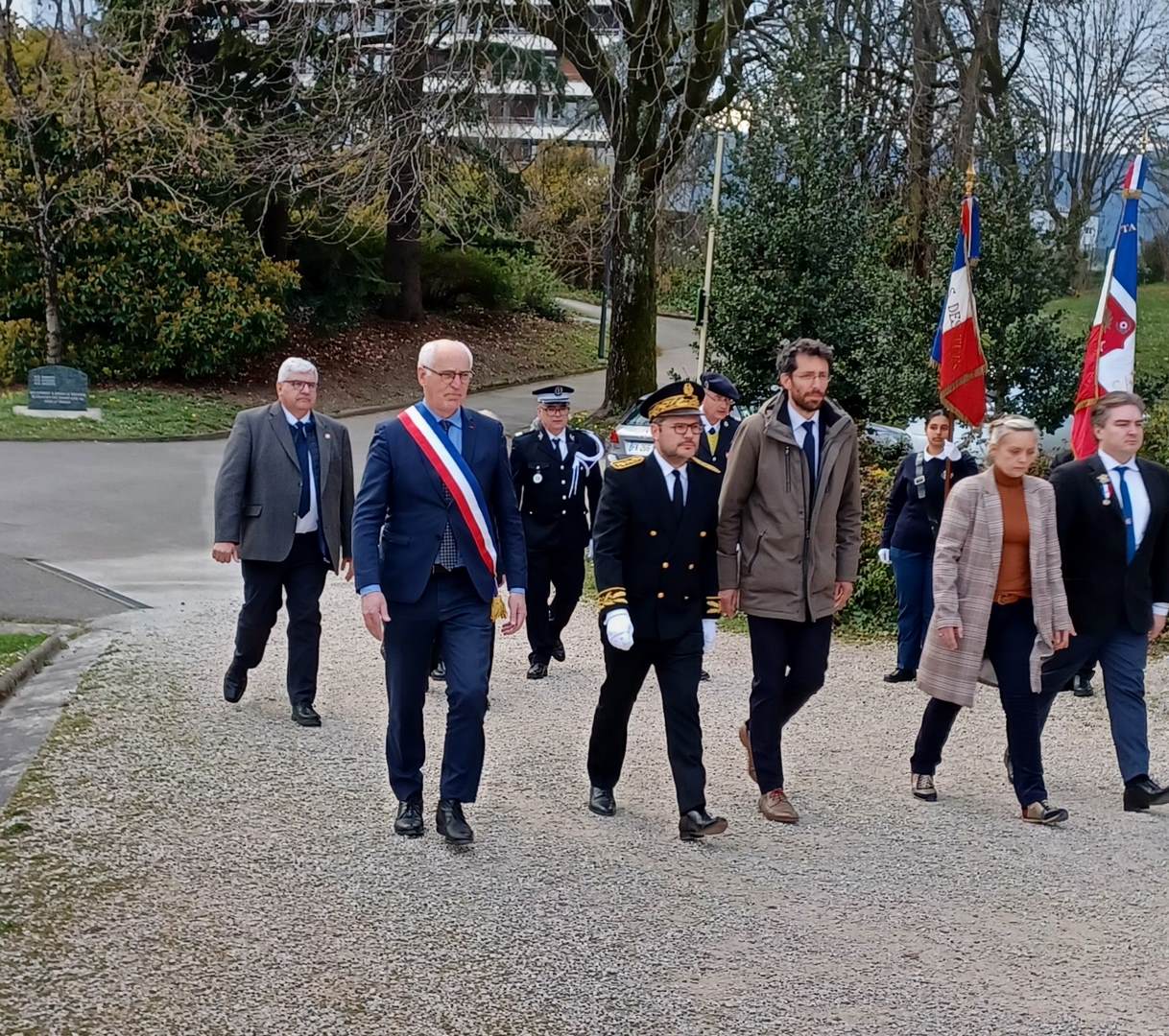 De nombreux porte-drapeaux étaient présents, entourant la délégation du Souvenir français, les présidents de comité, Chambéry, Combe de Savoie, de Henri Gottero président des anciens combattants cheminots de Savoie ainsi que des associations mémorielles.