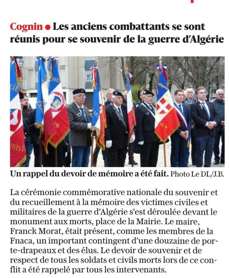 Mercredi 19 mars 2025, au monument aux Morts de Cognin, place de l Mairie, s'est déroulé la cérémonie départementale du 63ème anniversaire du Cessez le feu en Algérie, en présence des drapeaux et de Franck Morat, maire, des associations mémorileles, FNACA, Souvenir Français...