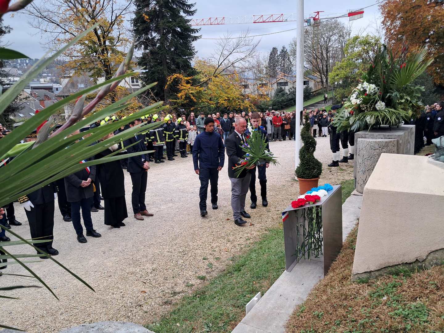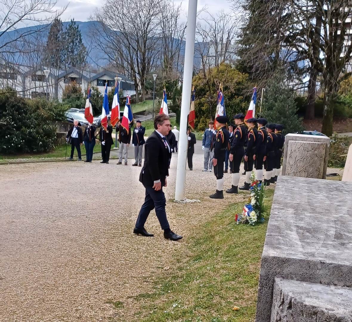 Jea-Yves Sardella, délégué général du Souvenir Français de Savoie a déposé une gerbe accompagné de deux jeunes de 2 élèves de la classe de formation d'agents de sécurité du Lycée Ste Anne de La Motte Servolex..