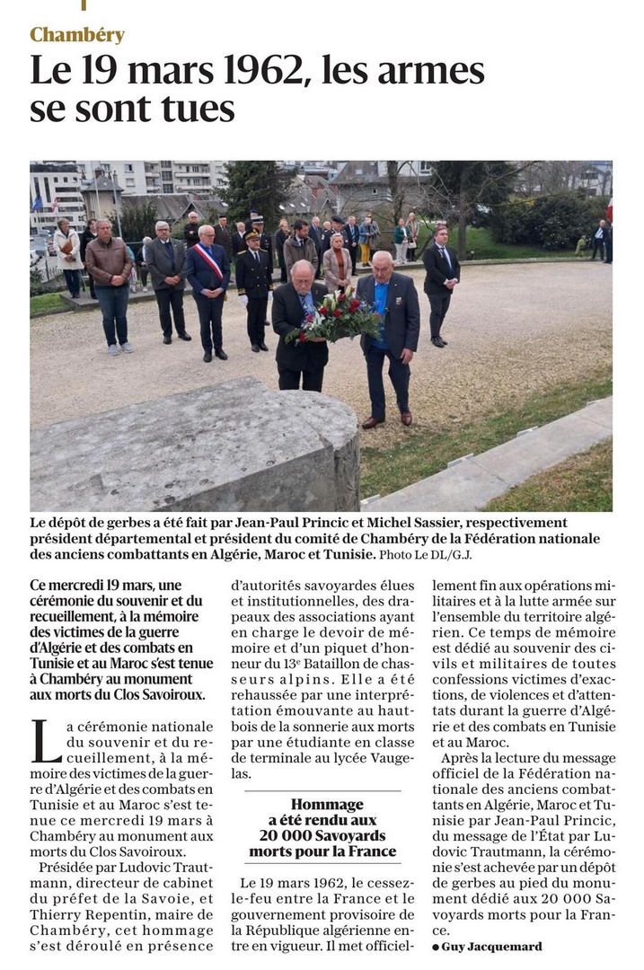 Mercredi 19 mars 2025, Clos Savoiroux à Chambéry, s'est déroulé la cérémonie départementale du 63ème anniversaire du Cessez le feu en Algérie, en présence de nombreux drapeaux et de personnalités civiles et militaires.