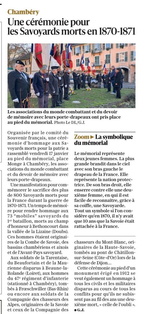 C'est devant le monument, place Monge à Chambéry, que s'est déroulée, le vendredi 17 janvier 2025, la cérémonie en hommage aux 73 Mobiles Savoyards, morts pour la Patrie au cours des journées des 15 et 16 janvier 1871.