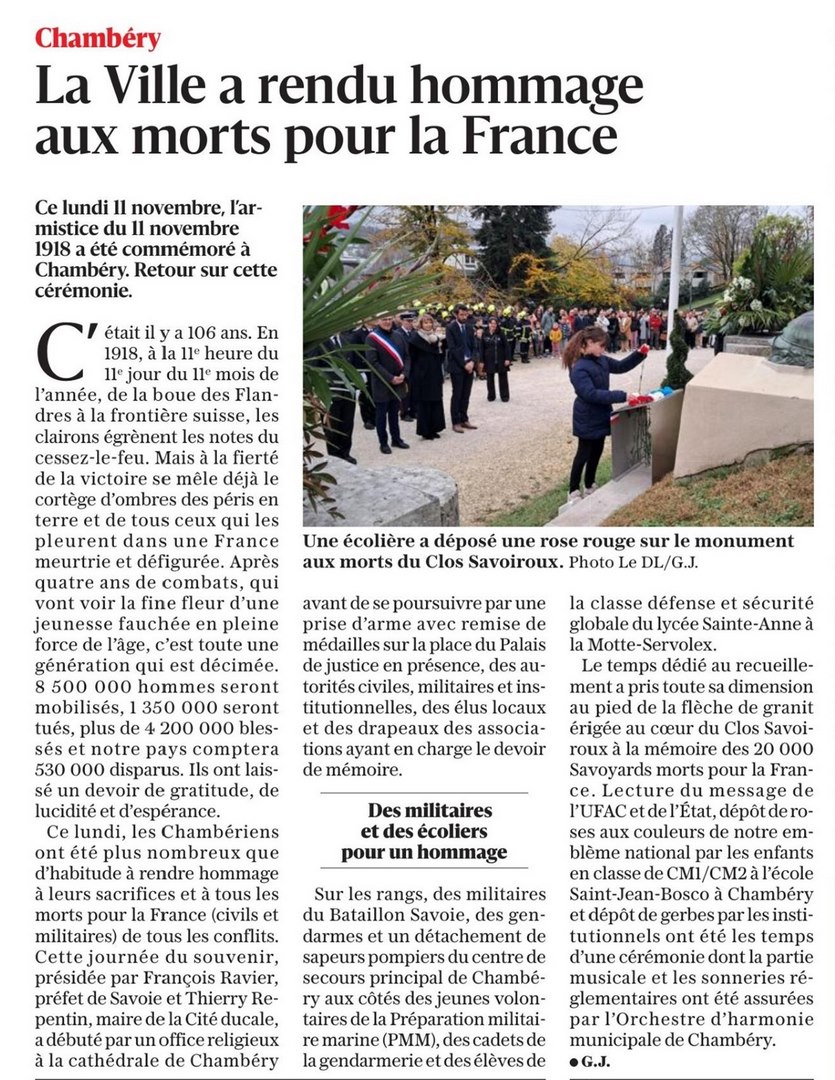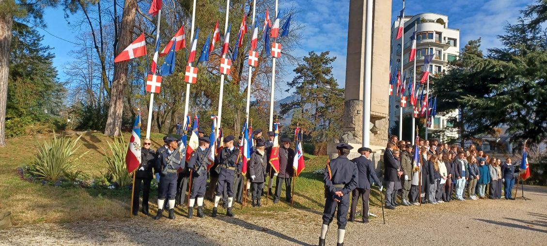 Lundi 11 novembre 2024, après un dépôt de gerbe en gare de Chambéry,se sont déroulées sur Chambéry, Chambéry le Vieux, Bissy et Cognin les cérémonies du 106ème anniversaire de l'armistice de 1918, en présence des autorités civiles et militaires, des association d'Anciens Combattants, du Souvenir Français, des jeunes du lycée Vaugelas de Chambéry, du Lycée Sainte Anne de La Mottre Servolex