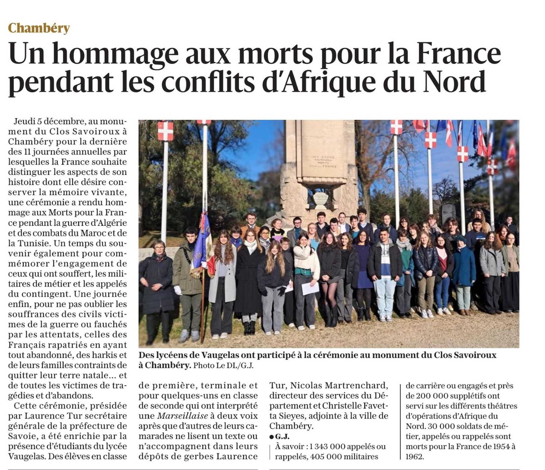 Mardi 05 décembre 2024, s'est déroulée, au Clos Savoiroux, la cérémonie en hommage aux combattants morts pendant la guerre d'Algérie et les combats du Maroc et de Tunisie, en présence des autorités locales et militaires, des associations mémorielles, dont le Souvenir Français et des porte-drapeaux.