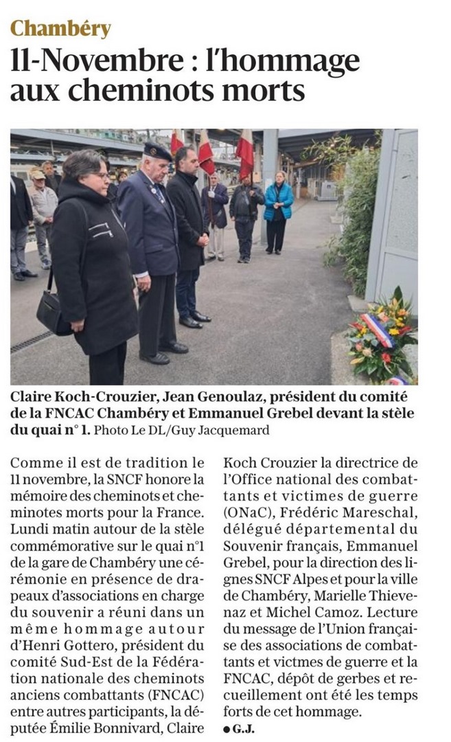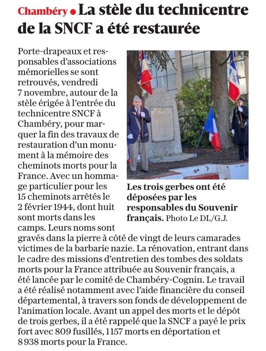 Lundi 3 février 2025 une cérémonie hommage s’est déroulée au pied de la stèle édifiée à l’entrée du TechniCentre SNCF à Chambéry en présence des autorités civiles et militaire et de représentants de la SNCF. Le Souvenir français était représenté par Henri Gottero et Jean-Yves Sardella, délégués généraux adjoints et le bureau, Roland Magdinier, président du comité de La Combe de Savoie,en maître de cérémonie, Charles-Antoine Bouttaz, président du comité de Montmélian ainsi que par plusieurs adhérents, les associations mémorielles et de nombreux porte-drapeaux.
