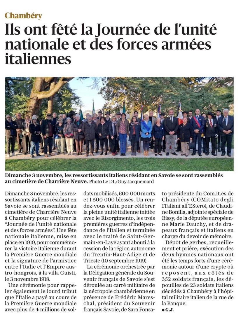 Dimanche 3 novembre 2024, au cimetière de Charrière-Neuve, s'est déroulée la cérémonie de commémoration, de l'Armistice italien du 4 novembre 1918, ainsi que la Journée de l'unité nationale italienne, organisée par le CO.MI.TES (Association des italiens à l'étranger) de Chambéry. C'est en présence de Mme Sara Fonsato, sa présidente, d'élus de Chambéry de la Délégation Générale du Souvenir Français de Savoie, ainsi que des porte-drapeaux, que trois gerbes ont été déposées devant la crypte du cimetière de Charrière-Neuve où reposent 25 soldats italiens après la lecture du texte du Président de la République Italienne, par Madame Fonsato.