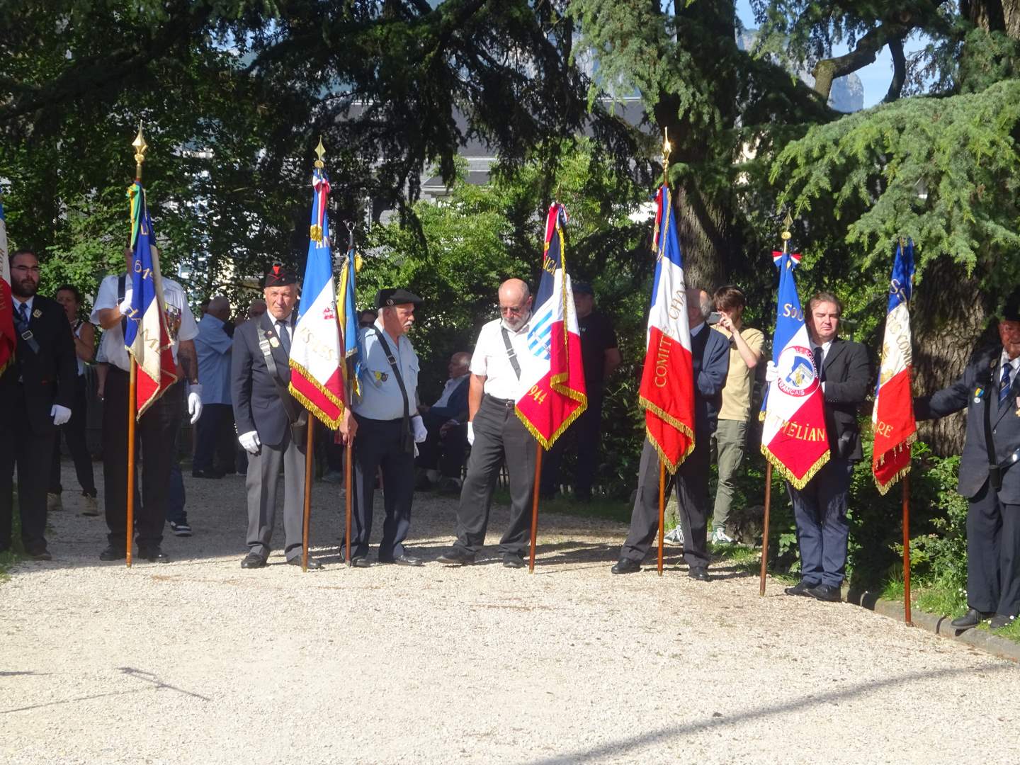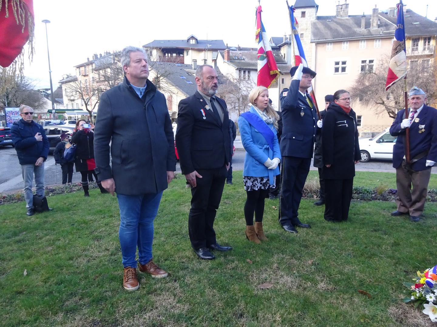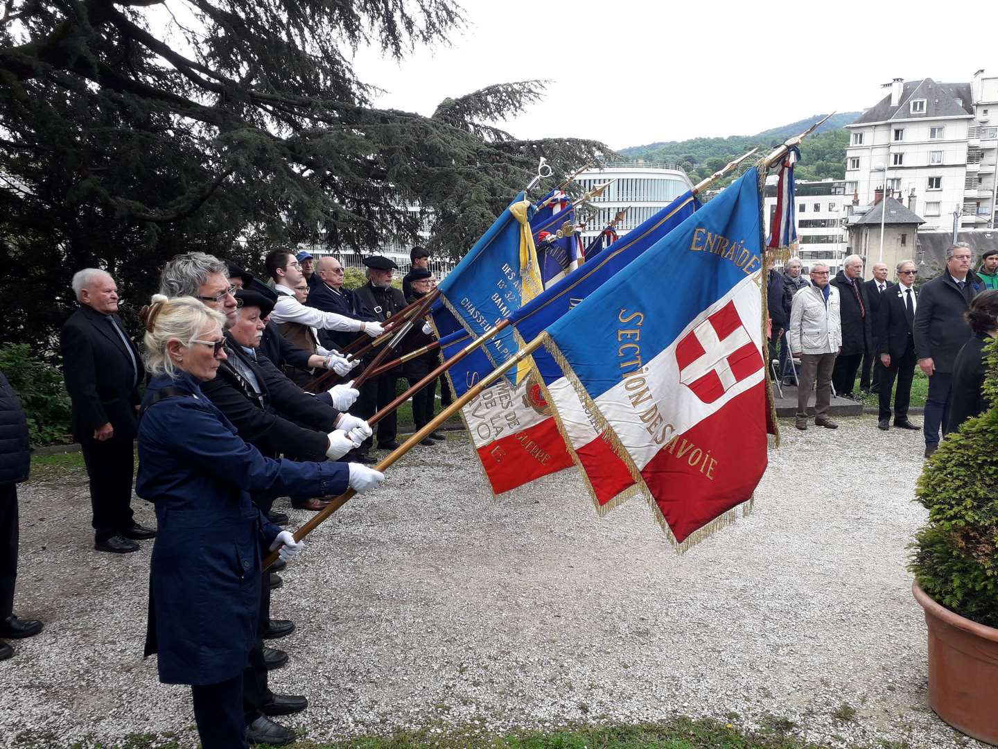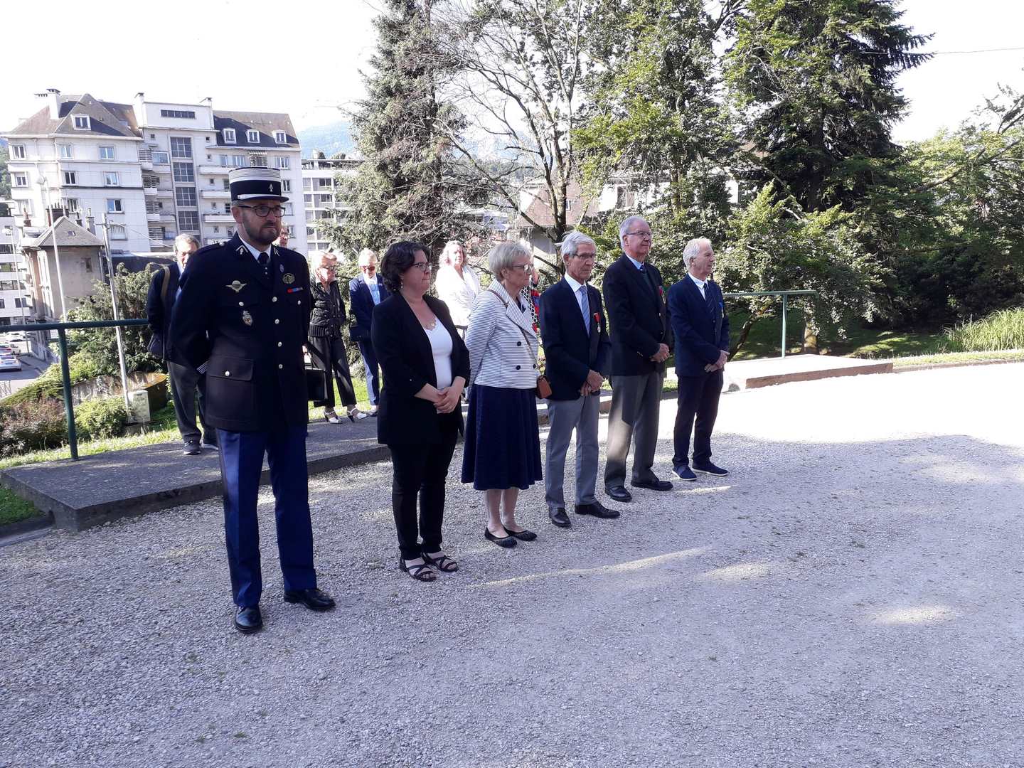 Dépôt de gerbe par les représentants . de l'Etat - secrétaire générale de la préfecture, . des Anciens Combattants : un ancien combattant, du Conseil Régional : Alexandra Turner, . du Conseil Départemental : Aloïs Chassot, . de la Municipalité : Gaëtan Pauchet, . de L'Assemblée Nationale : en son absence la gerbe a été d&posée par deux élèves de la classe défense du lycée du Nivolet de La Ravoire.
