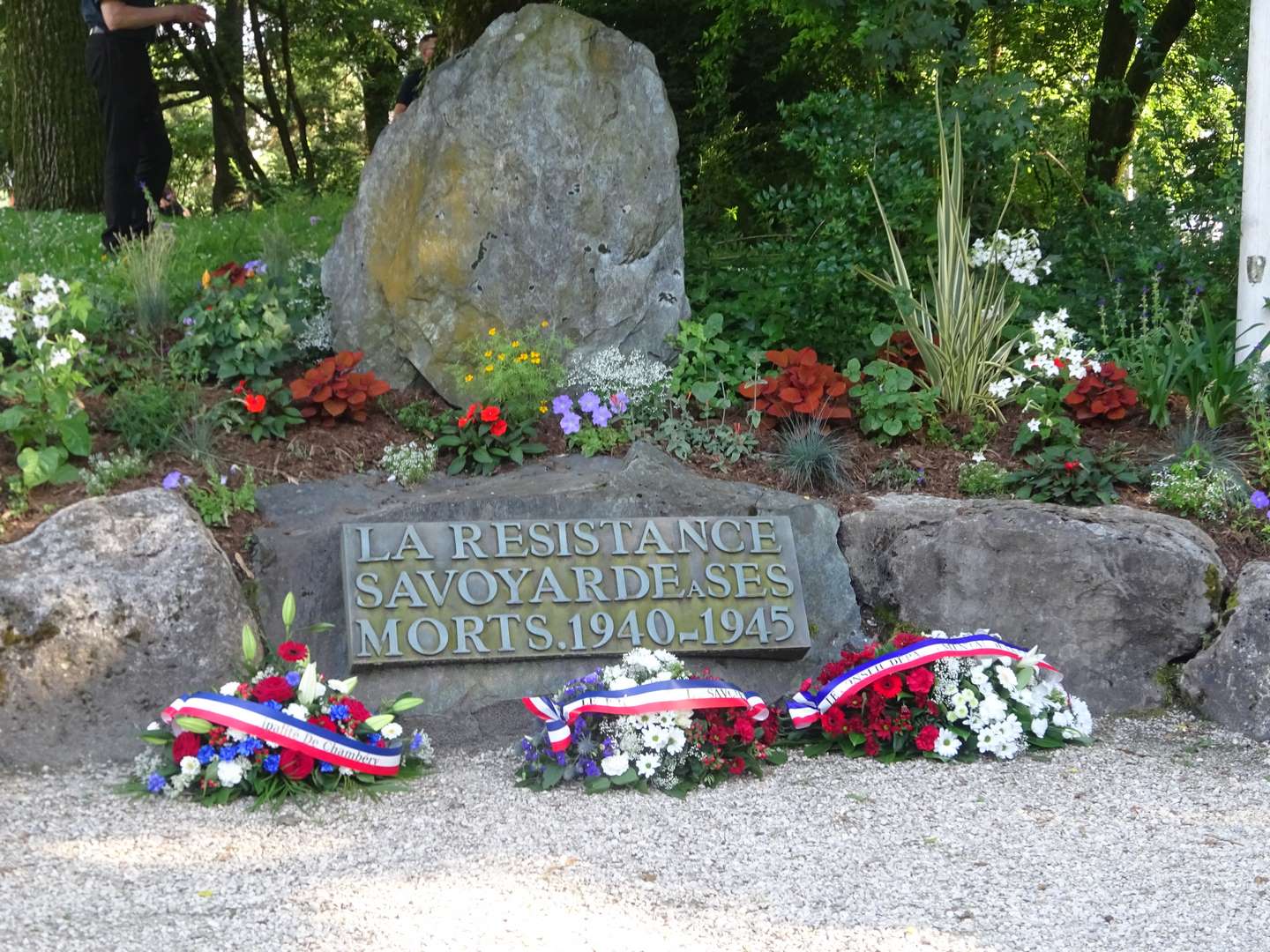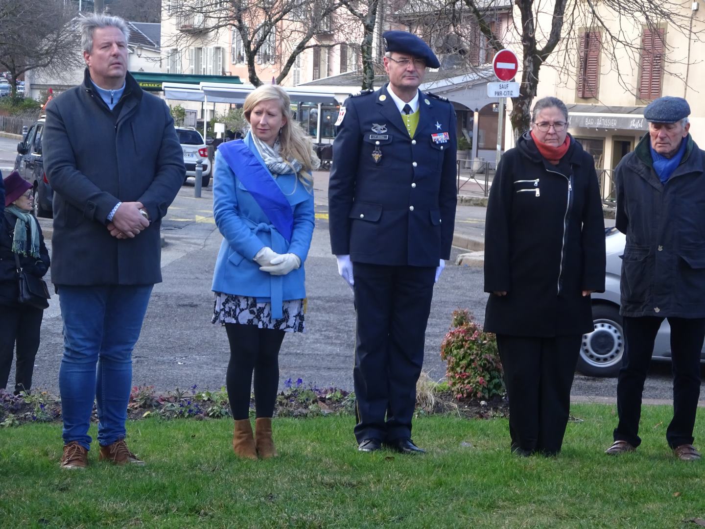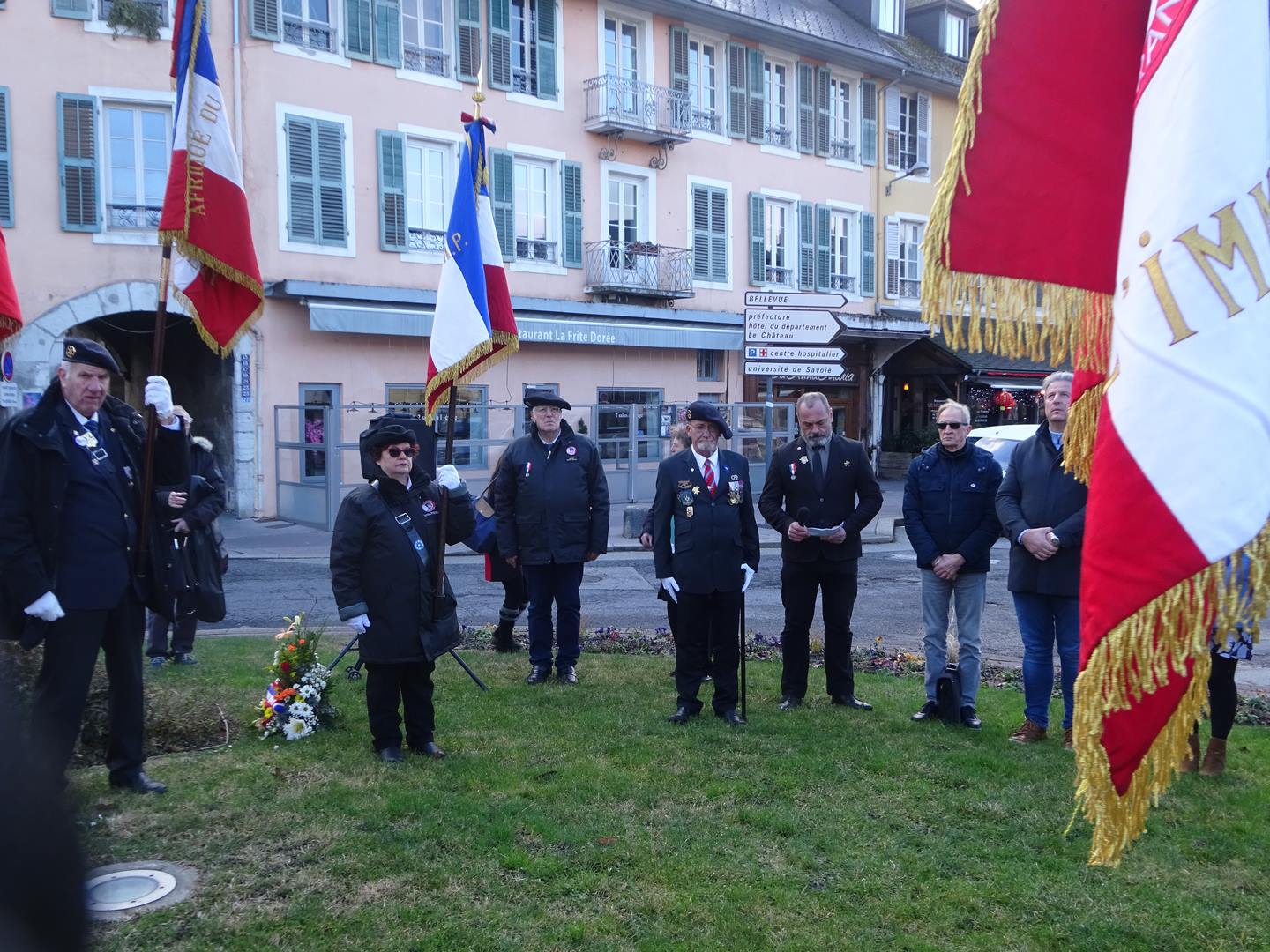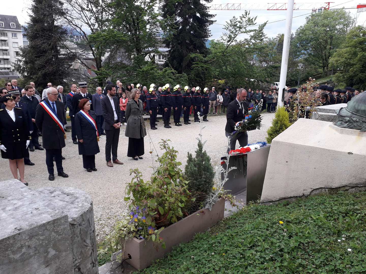 Dépôt de gerbe par les représentants . de l'Etat - secrétaire générale de la préfecture, . des Anciens Combattants : un ancien combattant, du Conseil Régional : Alexandra Turner, . du Conseil Départemental : Aloïs Chassot, . de la Municipalité : Gaëtan Pauchet, . de L'Assemblée Nationale : en son absence la gerbe a été d&posée par deux élèves de la classe défense du lycée du Nivolet de La Ravoire.
