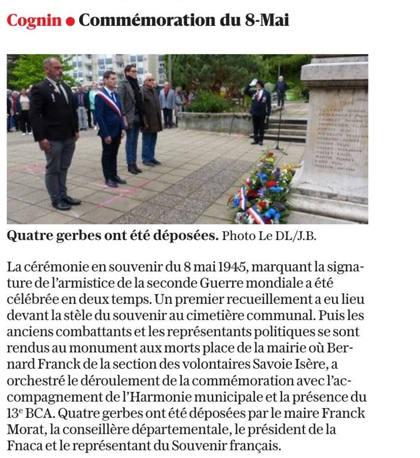 En ce 8 mai 2023, après une prise d'arme sur la place de la Mairie, la cérémonie s'est déroulée au Clos Savoiroux, au monuments aux Morts puis à la stèle de la Résistance, en présence des autorités civiles et militaires et des associations mémorielles. le Souvenir Français était représenté par Frédéric Mareschal délégué général de la Savoie et président du comité de Chambéry-Cognin