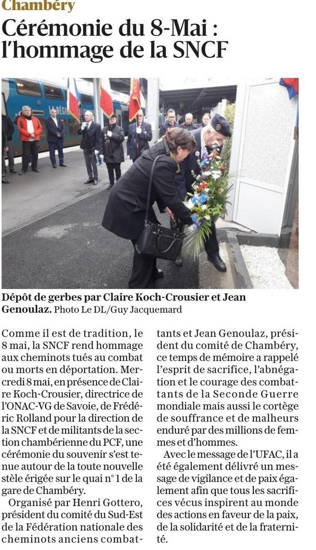 La cérémonie en hommage aux cheminots Morts pour la France s'est tenue comme chaque année sous la présidence de Messieurs Henri GOTTERO, Vice-Président National de la FNCAC, et Jean GENOULAZ, président FNCAC section de Chambéry.