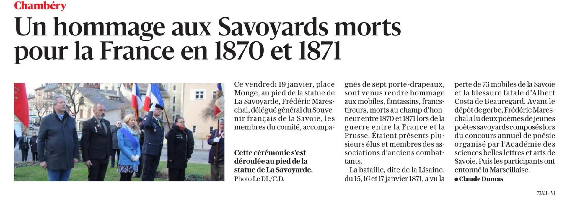 C'est devant le monument, place Monge à Chambéry, que s'est déroulée, le vendredi 19 janvier 2024, la cérémonie en hommage aux 73 Mobiles Savoyards, morts pour la Patrie au cours des journées des 15 et 16 janvier 1871.