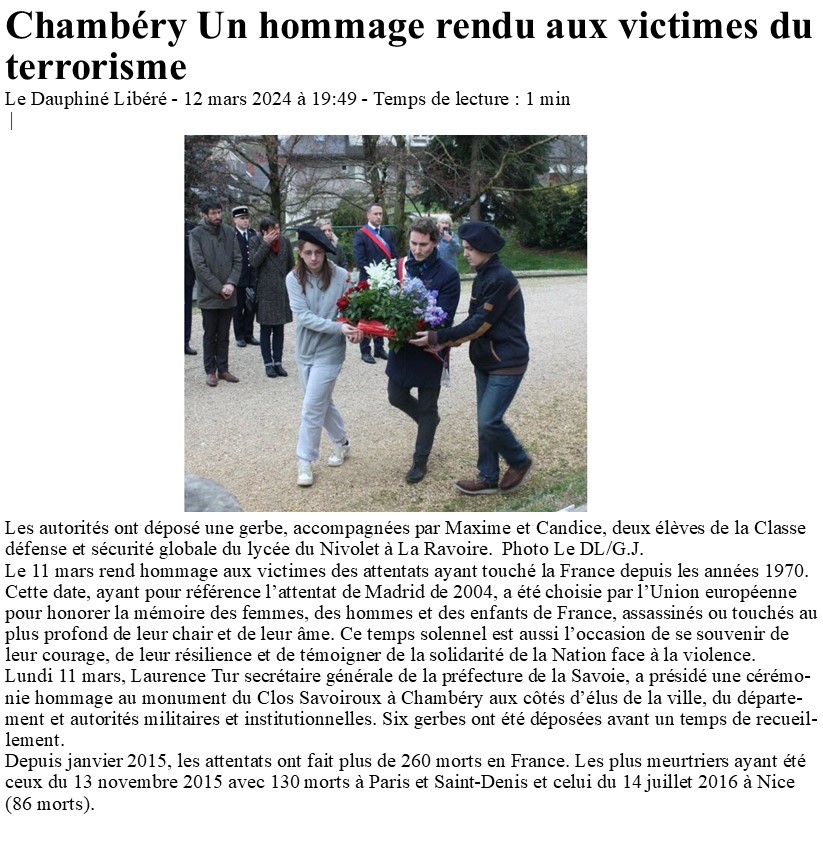 Lundi 11 mars s'est déroulée, au Clos Savoiroux de Chambéry, une cérémonie en hommage aux victimes du terrorisme en présence des autorités locales civiles et militaires, des porte-drapeaux et des associations mémorielles.