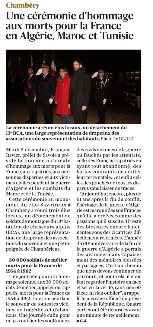 La Délégation Générale de Savoie du Souvenir Français était présente aux côtés des personnalités, au monument aux mort du Clos Savoiroux, à Chambéry, pour la cérémonie souvenir et du recueillement à la mémoire des victimes civiles et militaires de la guerre d'Algérie.