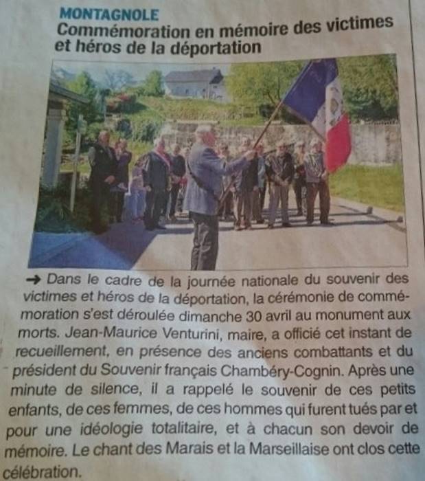 Dans le cadre de la journée nationale du souvenir des victimes et héros de la déportation, notre comité s'est rendu aux commémorations de Chambéry et de Montagnole.