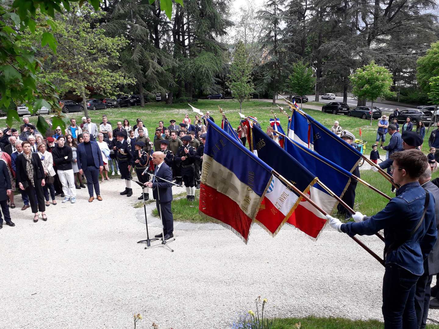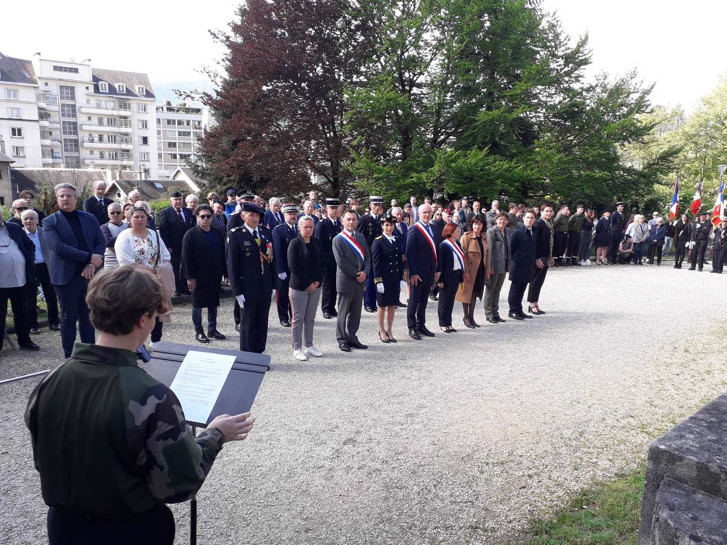 En ce 8 mai 2023, après une prise d'arme sur la place de la Mairie, la cérémonie s'est déroulée au Clos Savoiroux, au monuments aux Morts puis à la stèle de la Résistance, en présence des autorités civiles et militaires et des associations mémorielles. le Souvenir Français était représenté par Frédéric Mareschal délégué général de la Savoie et président du comité de Chambéry-Cognin