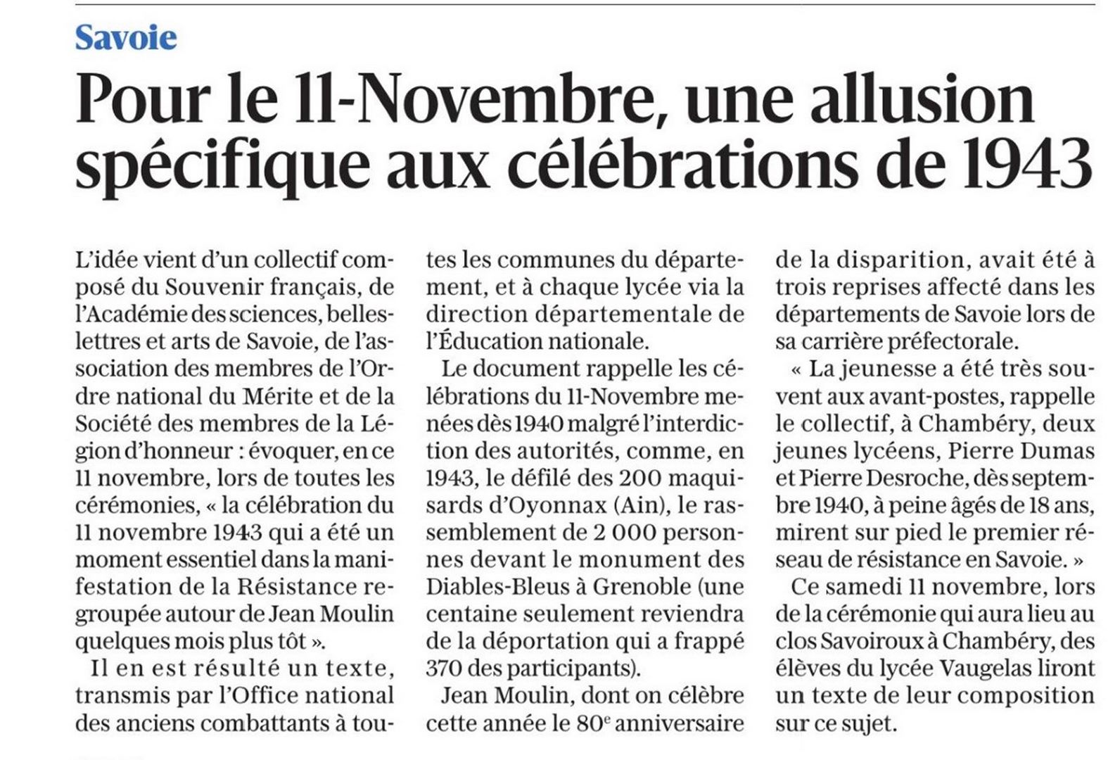 Samedi 11 novembre 2023, après un dépôt de gerbe en gare de Chambéry,se sont déroulées sur Chambéry et Bissy les cérémonies du 105ème anniversaire de l'armistice de 1918, en présence des autorités civiles et militaires, des association d'Anciens Combattants, du Souvenir Français, des jeunes du lycée Vaugelas de Chambéry, du Lycée Sainte Anne de La Mottre Servolex et de l'association "Le Fil de Marianne".