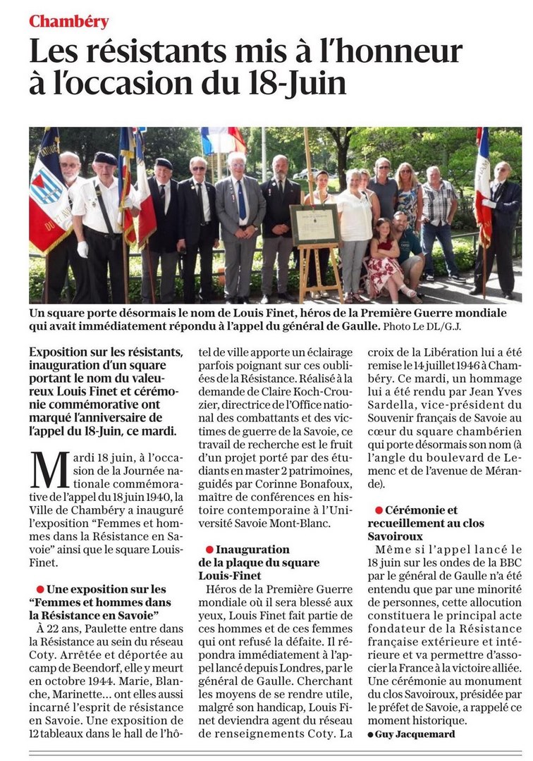 Mardi 18 juin 2024 a vu le dévoilement de la plaque du Square Louis Finet, situé au niveau des feux de Mérande, sous le Clos Savoiroux. La maison de Louis Finet se situait tout proche de ce lieu. C'est en présence de sa famille, de Monsieur le maire de Chambéry, des autorités civiles, de la délégation générale du Souvenir Français, que Jean-Yves Sardella, DGA, à retracé le parcours de Louis Finet.