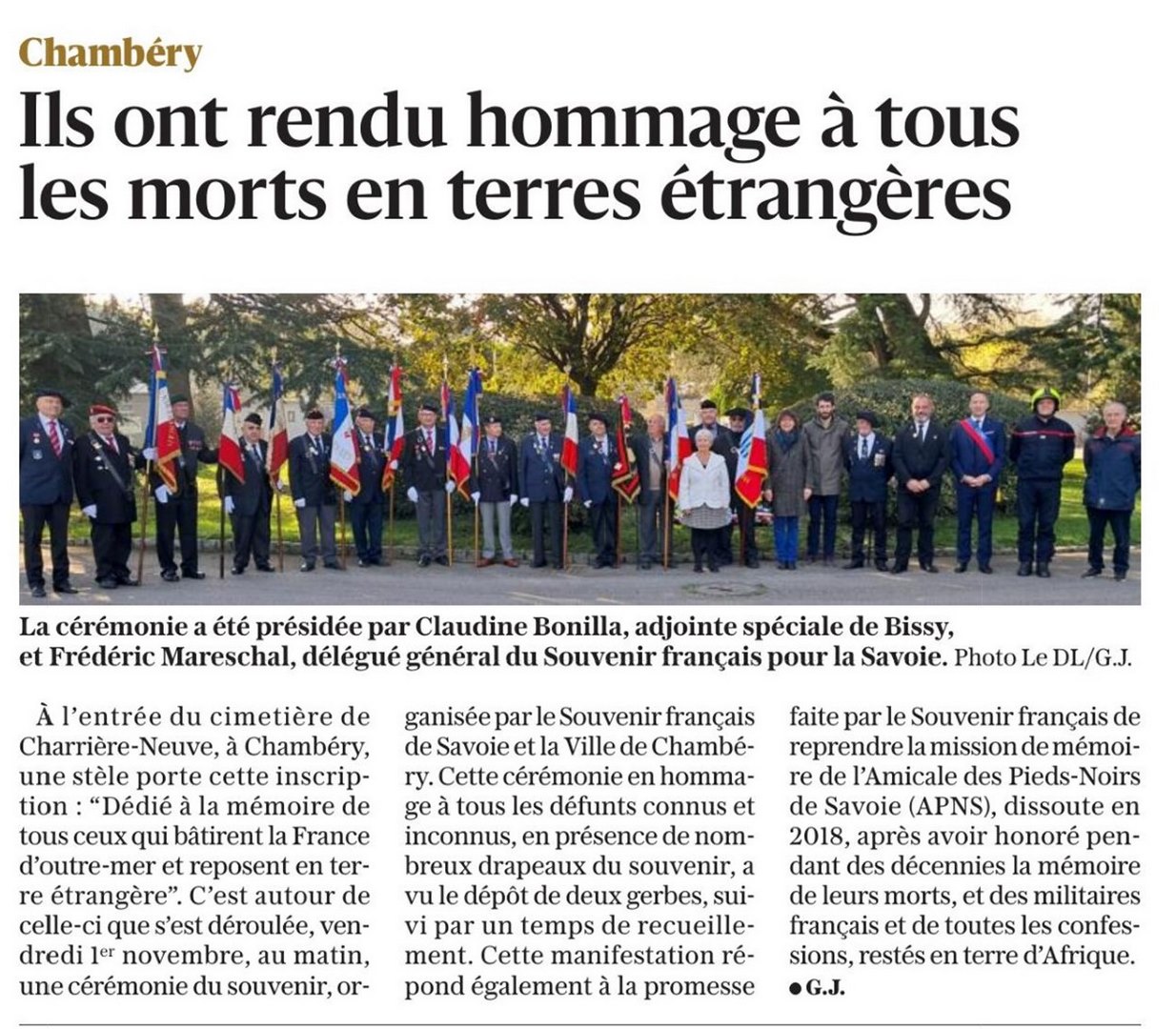Comme chaque année depuis la dissolution de l'Amicale des Pieds-Noirs de Savoie le 1er novembre 2018, le Comité du Souvenir Français de Chambéry-Cognin, en partenariat avec la municipalité de Chambéry, perpétue la cérémonie d'hommage aux Français qui bâtirent la France d'Outre-mer, morts et enterrés à l'étranger.