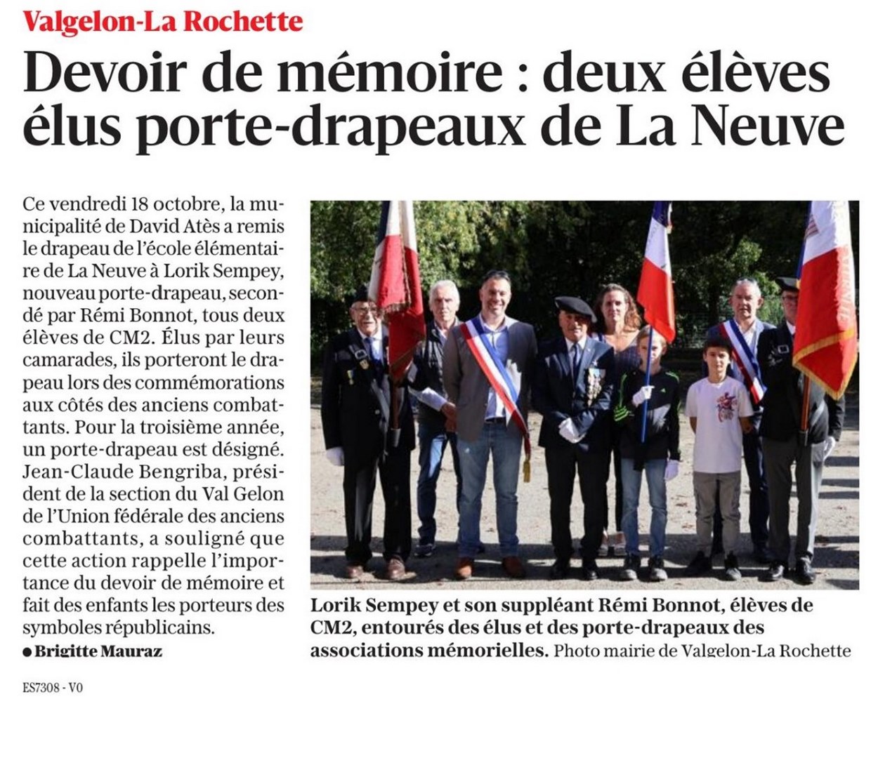 Remise du drapeau de l'école de la Neuve de Valgelon-La Rochette aux nouveaux élèves porte-drapeaux, ce vendredi 18 octobre 2024, en présence de Mr le maire David Arès et de Jean-Claude Bengriba, Présudent des Anciens Combattants.
