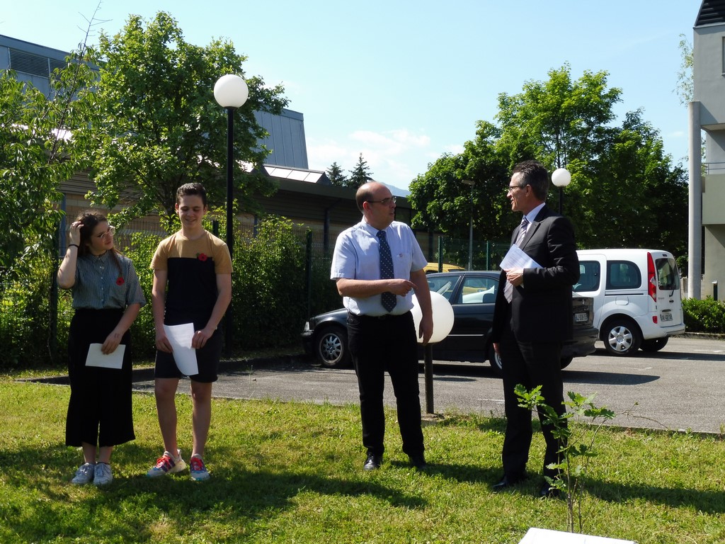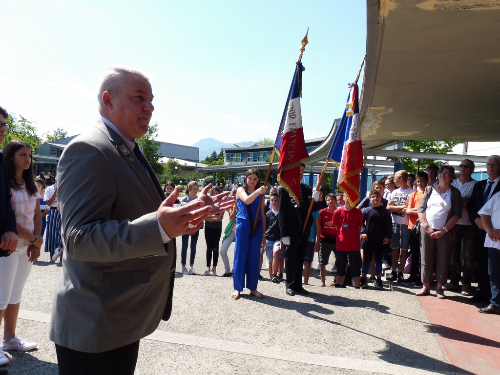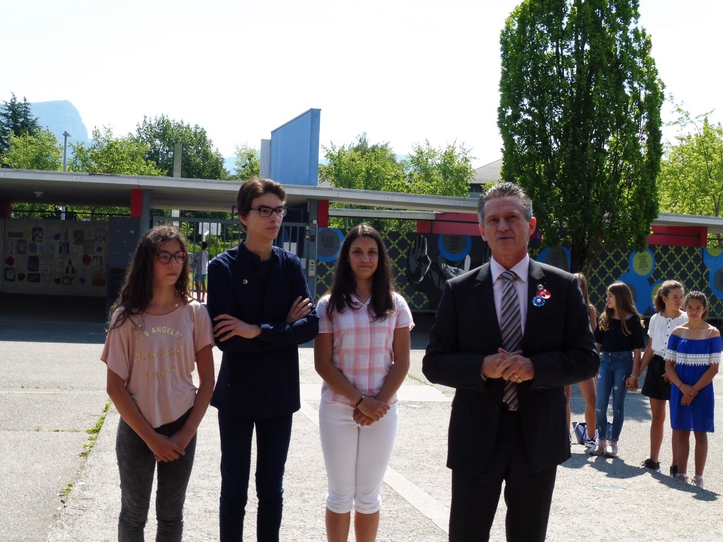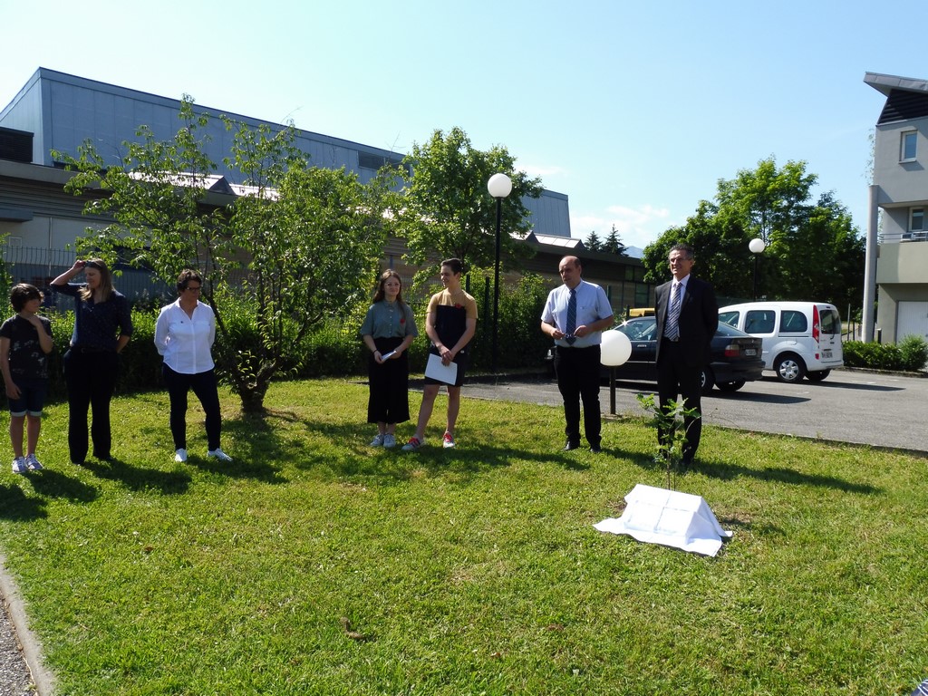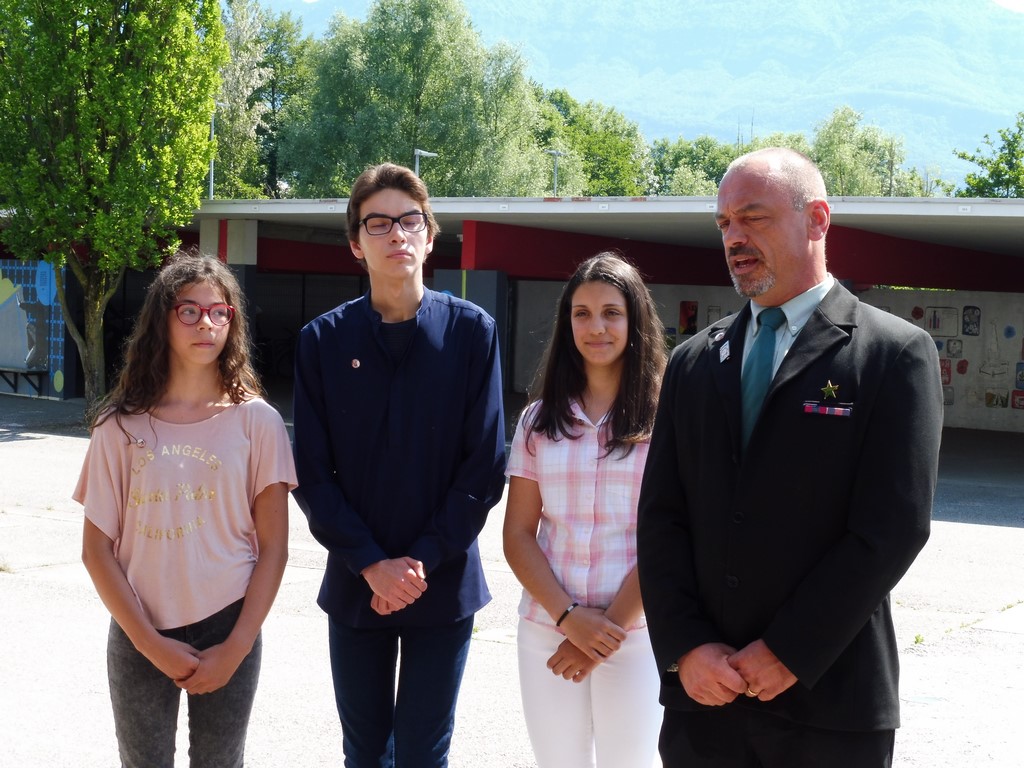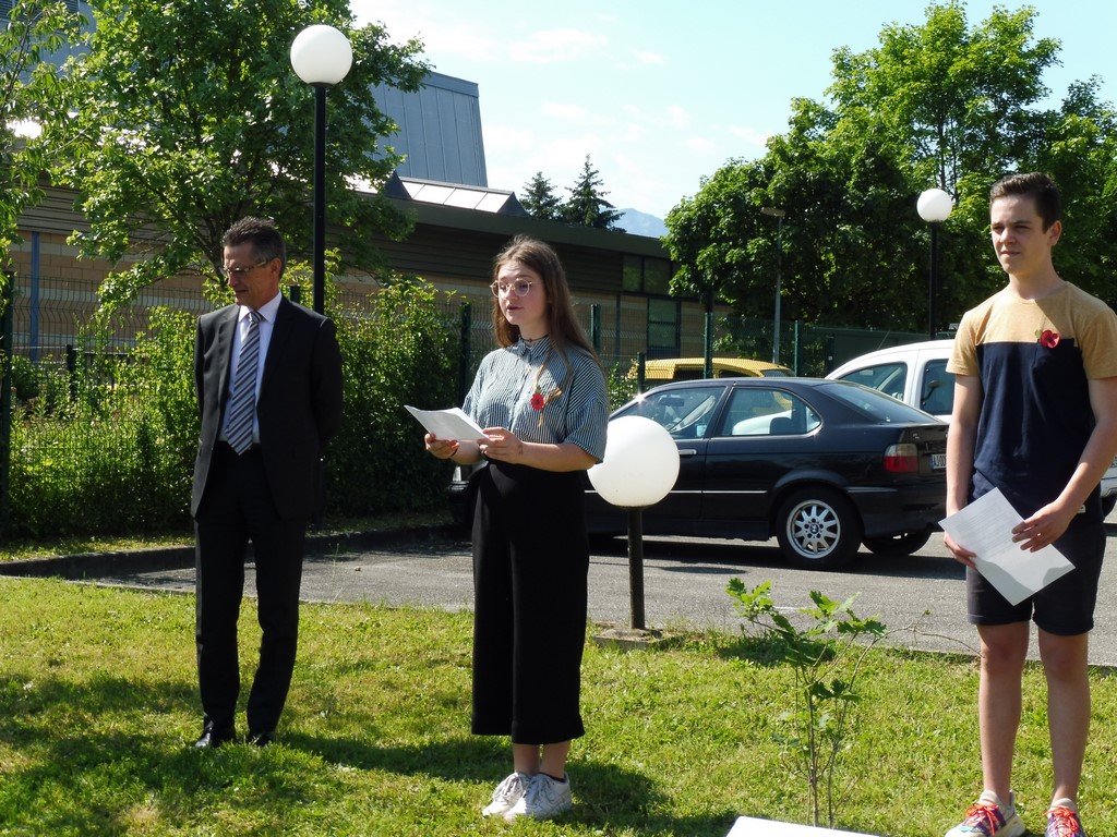 Une plaque explicative, élaborée par Martial Baton, a été dévoilée, ce mercredi 5 juin, par les élèves. Cette cérémonie solennelle eut lieu, en présence d'élèves, de professeurs, de Mr Claude Delbos, Proviseur, de Mr Eric Lavis, Directeur académique ainsi que des membres de la Délégation Générale du Souvenir Français de Savoie et de son Délégué Général, Frédéric Mareschal, de Laurent Grillaud, président du comité de la Motte Servolex et de Gaëlle Vacher-Oreiller professeur d’Histoire au collège et également secrétaire du comité de la Motte Servolex.