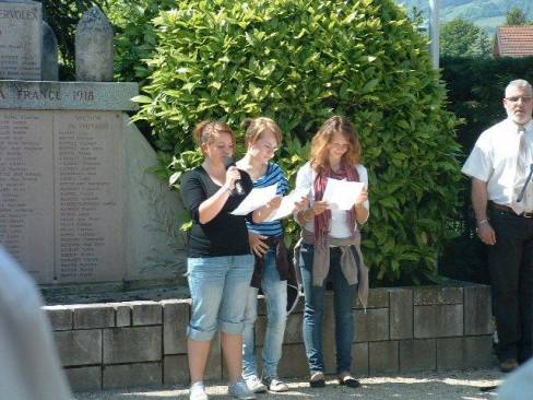 Après les discours officiels et du devoir de mémoire, ce furent trois jeunes élèves de 3° A du collège de Boigne, Océane, Magalie et Anaïs qui ont lu un poème inspiré de "Liberté" de Paul Eluard et renommé "Amitié", ce dernier étant le fruit du travail sur la poésie française initié par leur professeur Mme Viala.