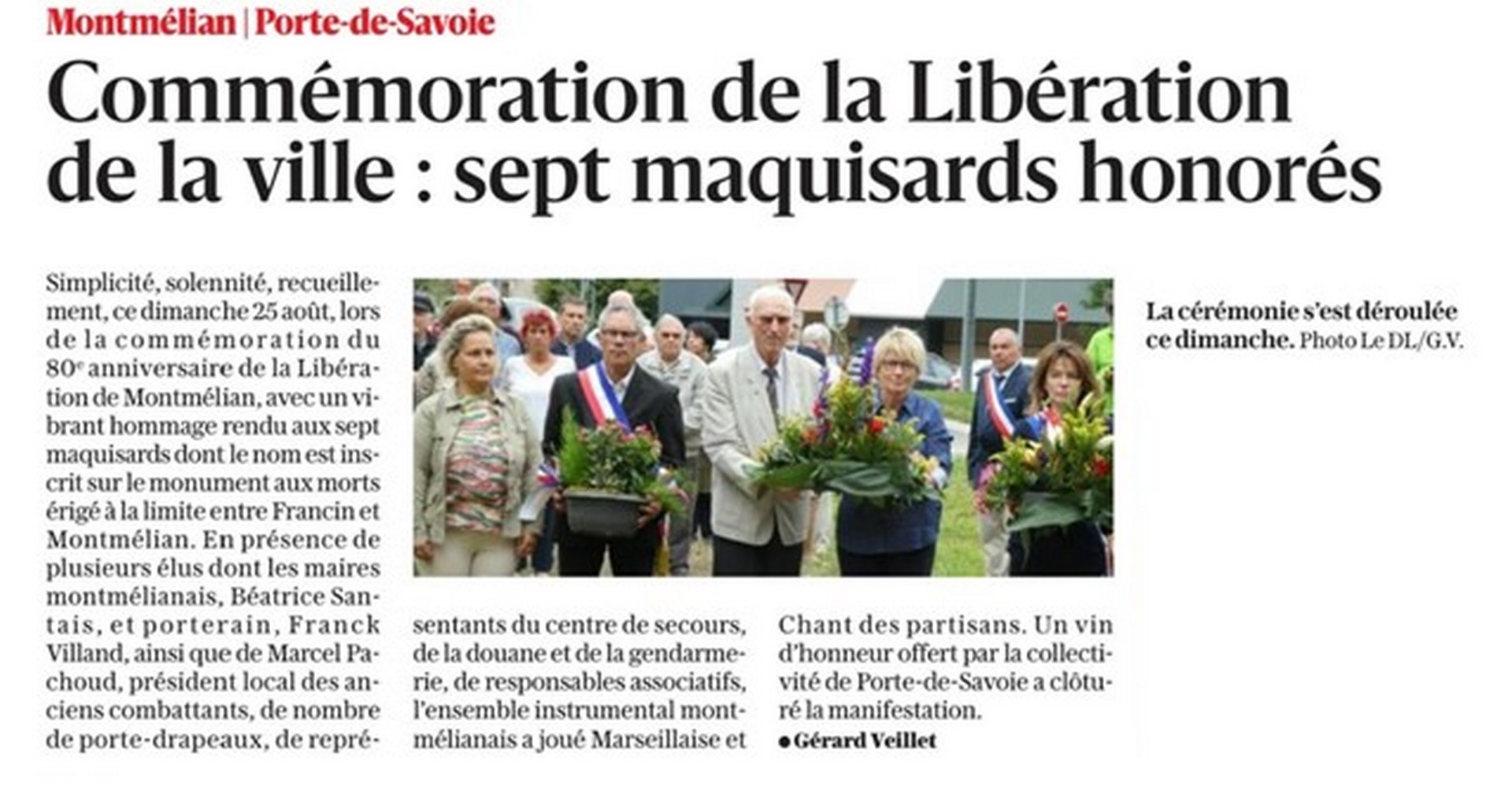 C'est en présence de Mesdames Béatrice Santais, Maire de Montmélian, Caroline Levannier, maire déléguée de Francin, Franck Villand, maire de Porte-de-Savoie, des maires des communes voisines, des sapeur pompiers, de la gendarmerie, du Souvenir Français représenté par Frédéric Mareschal, délégué général, Jean-Yves Sardella, délégué général adjoint et porte drapeau de la commune déléguée de Francin, deCharles-Antoine Bouttaz, président du comité de Montmélian, de Christiane Bert-Marcaz, présidente du comité de Saint Alban Leysse, de membres et portes-drapeaux de différents comités et des associations mémorielles, que s'est déroulée la cérémonie commémorative du 80ème anniversaire de la libération de Montmélian.