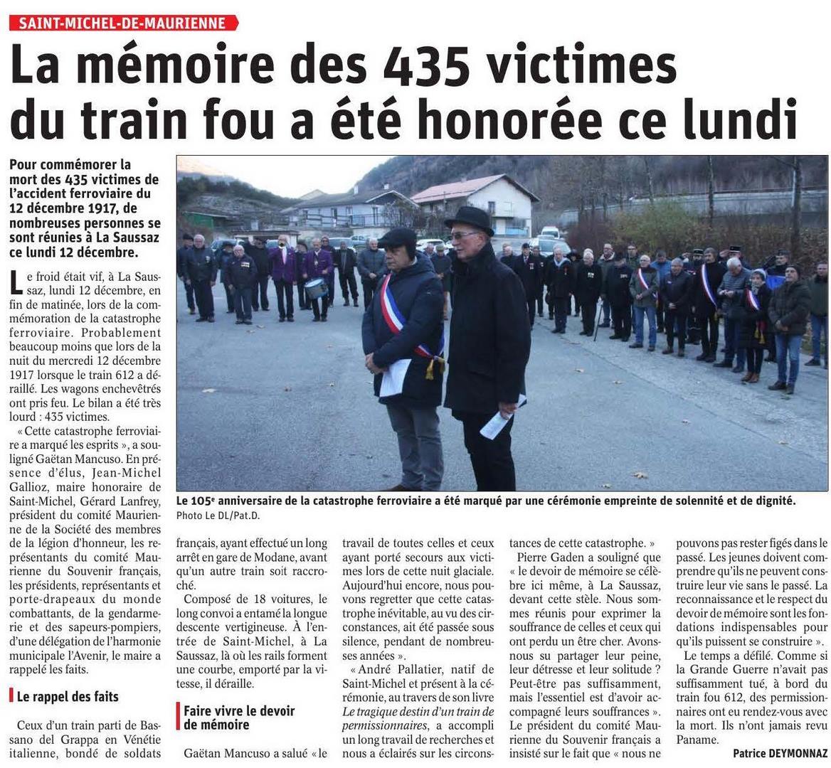 Le 12 décembre 2022 à Saint Michel de Maurienne, s'est déroulée une cérémonie en hommage aux victimes du déraillement du 12 décembre 1917.