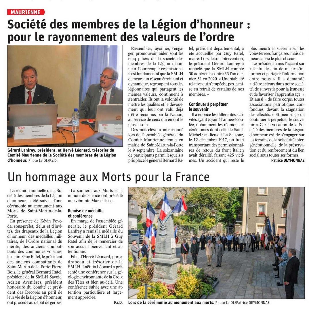 Vendredi 9 septembre s'est déroulée l'assemblée générale de la Société des Membres de la Légion d'Honneur à Saint Martin de la Porte, en présence de la délégation générale du Souvenir Français de Savoie représentée par Henri Gottero et Jean-Yves Sardella tous deux délégués généraux adjoints.
