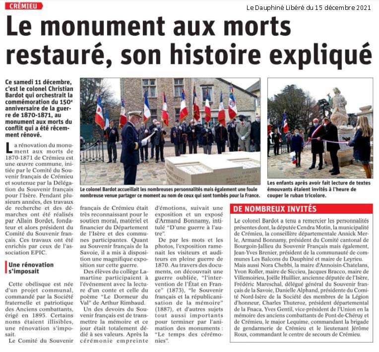Samedi 11 décembre 2021, à Crémieu (Isère) s'est déroulée une cérémonie en commémoration du 150ème anniversaire de la guerre de 1870-1871. Pour cette occasion le monument, érigé en 1895, à été rénové à l'initiative du comité du Souvenir Français de Crémieu et de la délégation générale de l'Isère.
