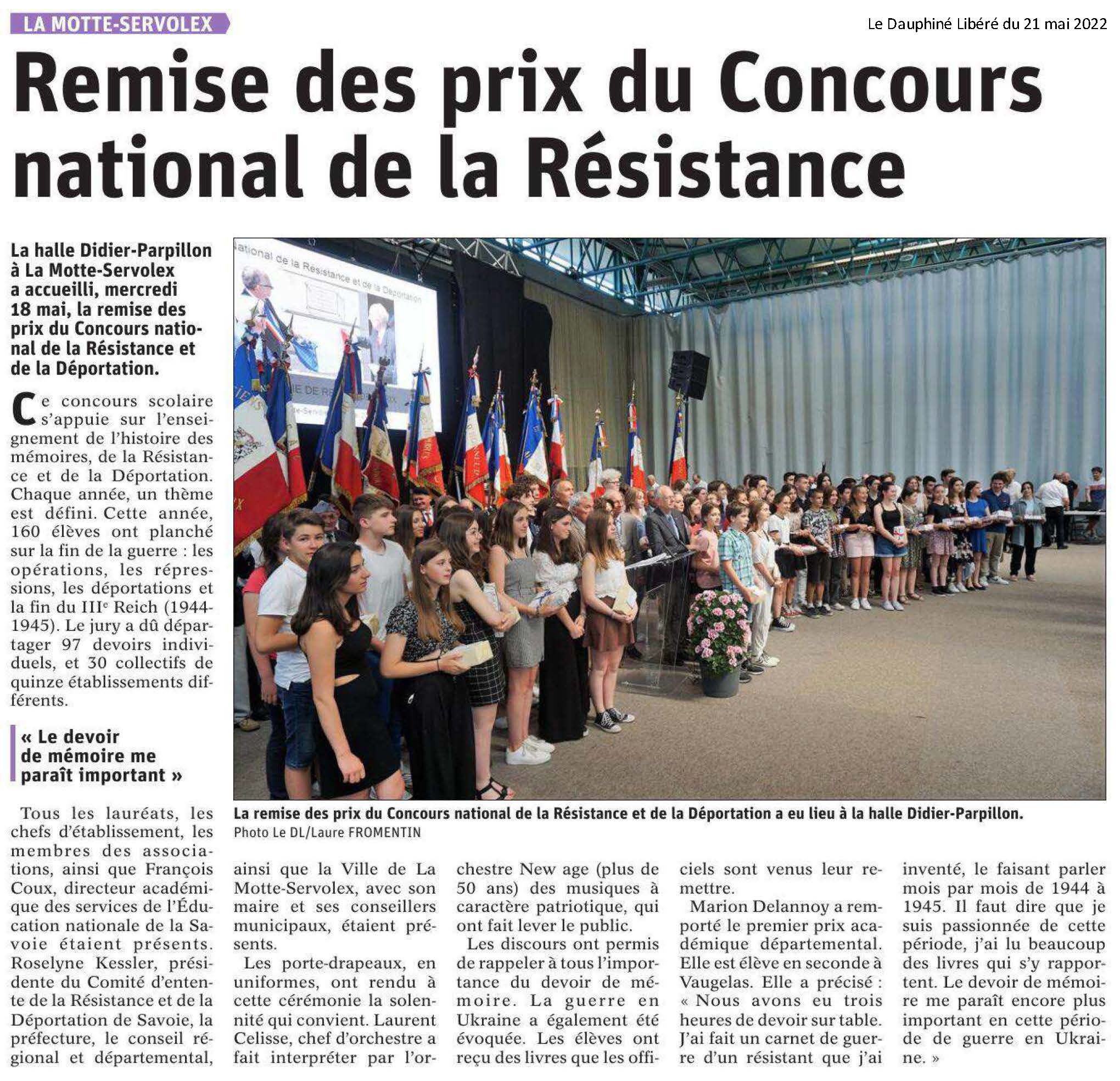 La cérémonie départementale de remise des prix du Concours national de la Résistance et de la Déportation, organisée par le Conseil départemental en étroite collaboration avec la Direction des Services Départementaux de l'Education Nationale , le Comité de la Résistance et de la Déportation, présidé par Roselyne Kessler et les associations de Mémoire, a eu lieu le mercredi 18 mai 2022 à 14h dans la salle Didier Parpillon, à La Motte Servolex. Ce fut l’occasion de valoriser le travail de grande qualité des collégiens et lycéens de Savoie.