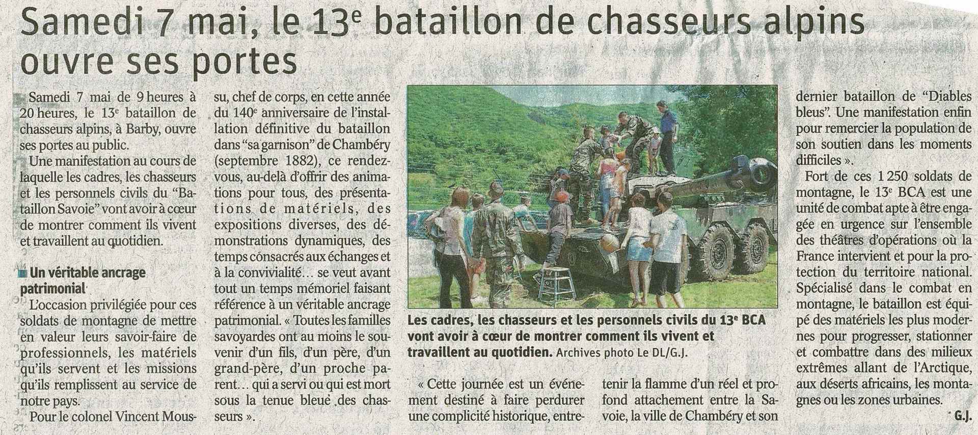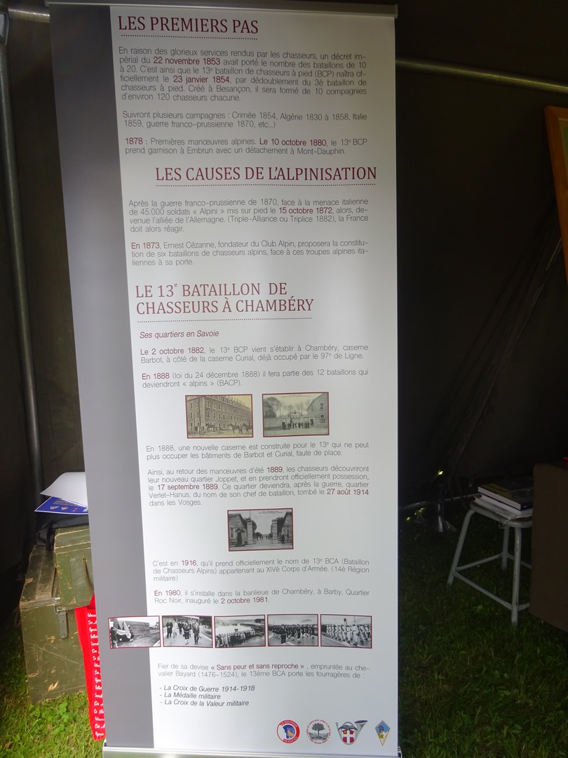 A l'occasion de du 140° anniversaire de l'arrivée du 13° Bataillon de Chasseurs à Chambéry. Bataillon de Chasseurs à Pied devenu Bataillon Alpin de Chasseurs à Pied en 1888 puis en 1916 il prend officiellement le nom de Bataillon de Chasseurs Alpins, plusieurs évènements vont se dérouler sur site et à Chambéry.