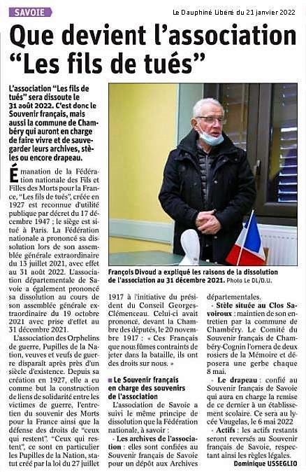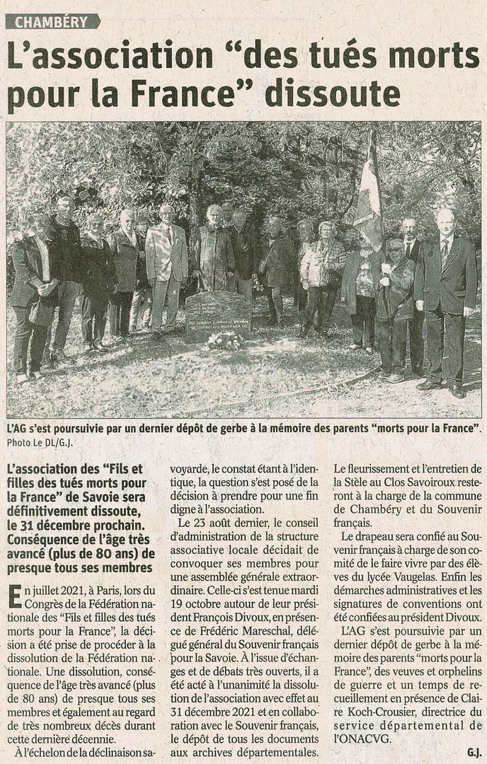 L'association des "Fils et filles des tués morts pour la France" de Savoie sera définitivement dissoute, le 31 décembre. En juillet 2021, à Paris, lors du Congrès de la Fédération nationale des "Fils et filles des tués morts pour la France", la décision a été prise de procéder à la dissolution de la Fédération nationale. Une dissolution, conséquence de l'âge très avancé (plus de 80 ans) de presque tous ses membres et également au regard de très nombreux décès durant cette dernière décennie.