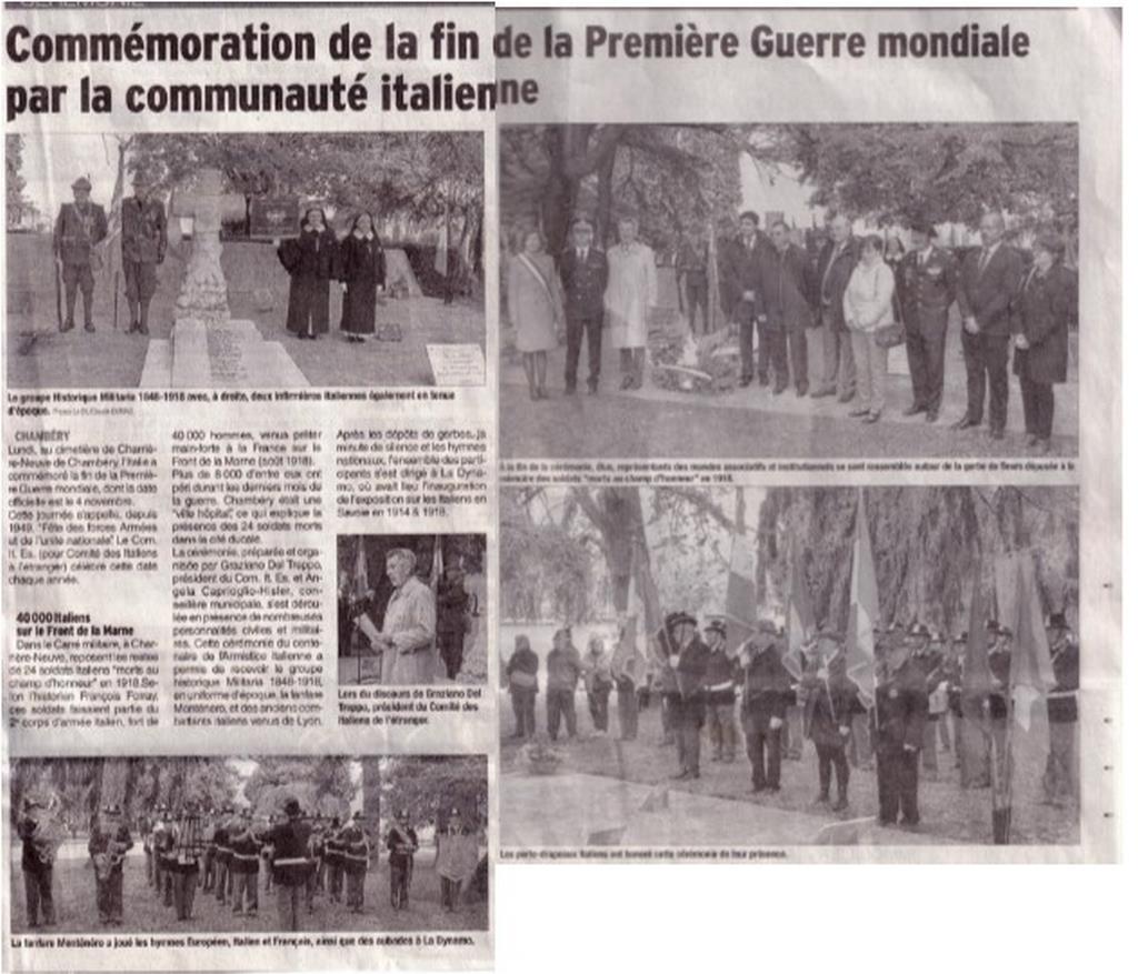 Lundi 5 novembre s'est déroulée , en partenariat avec le COMITES et le Souvenir Français de Savoie, au cimetière de Charrière Neuve, à Chambéry, une cérémonie pour célébrer le Centenaire de l'armistice italien du 4 novembre 1918, en présence du premier secrétaire de l'Ambassade d'Italie à Paris, de Mr A. Bertoni Consul Général d'Italie, de Mme N. Colin-Cocchi adjointe au maire de Chambéry, de Mr G. Del Treppo président du COMITES, de Mr F. Mareschal délégué général du Souvenir Français Savoie, de la Mission catholique italienne, du groupe historique "Militaria 1848 - 1918" et de la fanfare "Montenero" des "Alpini" de Turin.