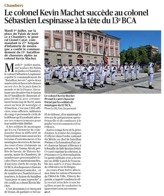 Le colonel Kevin Machet a succédé au colonel Sébastien Lespinasse comme chef de corps du 13è Bataillon de Chasseurs Alpins et délégué militaire départemental de Savoie.